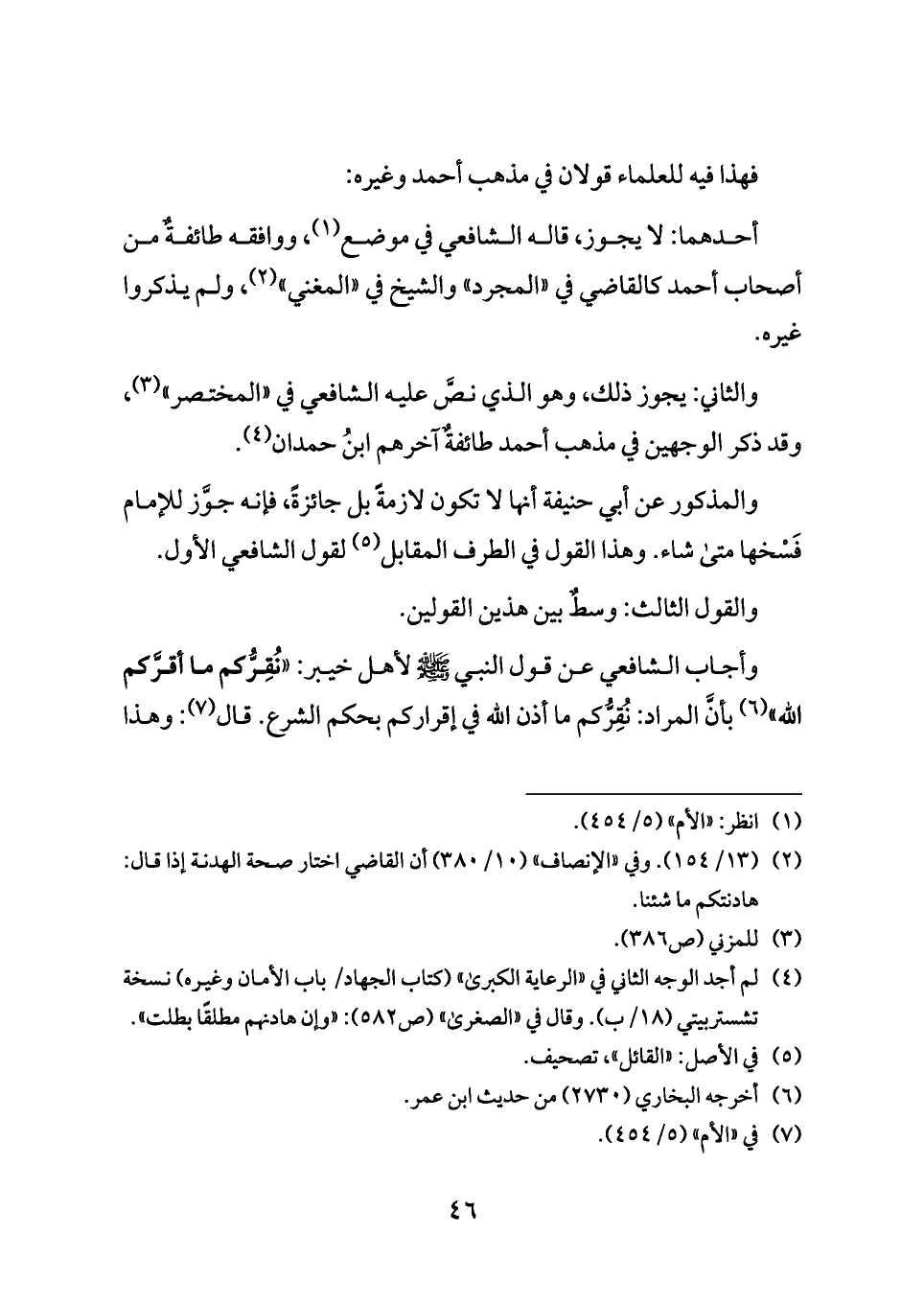 (¬٤) لم أجد الوجه الثاني في «الرعاية الكبرى» (كتاب الجهاد/ باب الأمان وغيره) نسخة تشستربيتي (١٨/ب). وقال في «الصغرى» (ص ٥٨٢): «وإن هادنهم مطلقًا بطلت».
