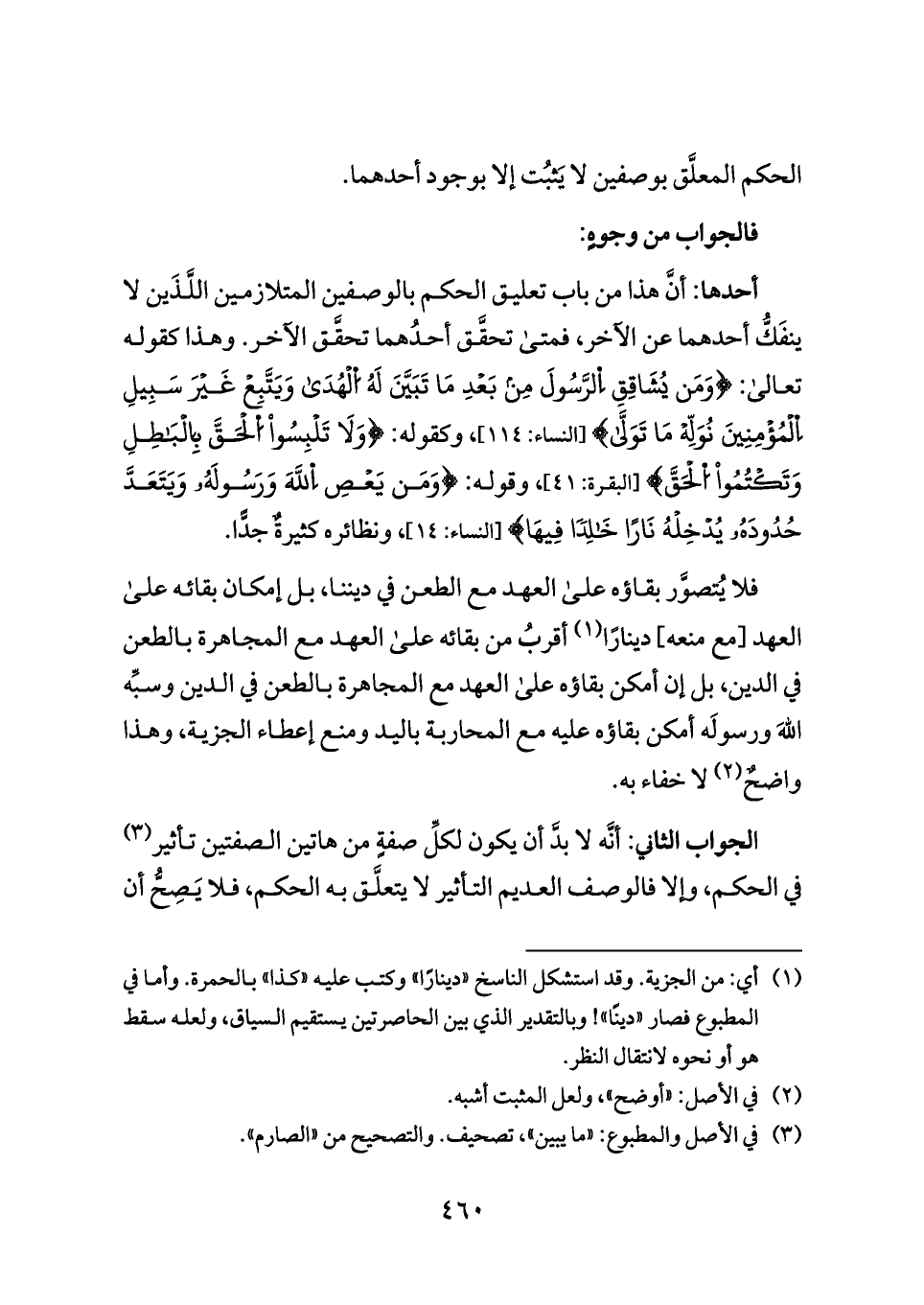 أحدها: أنَّ هذا من باب تعليق الحكم بالوصفين المتلازمين اللَّذَين لا ينفَكُّ أحدهما عن الآخر، فمتى تحقَّق أحدُهما تحقَّق الآخر. وهذا كقوله تعالى: {وَمَن يُشَاقِقِ اِلرَّسُولَ مِن بَعْدِ مَا تَبَيَّنَ لَهُ اُلْهُدَى وَيَتَّبِعْ غَيْرَ سَبِيلِ اِلْمُؤْمِنِينَ نُوَلِّهْ مَا تَوَلَّى} [النساء: ١١٤]، وكقوله: {وَلَا تَلْبِسُوا اُلْحَقَّ بِالْبَاطِلِ وَتَكْتُمُوا اُلْحَقَّ} [البقرة: ٤١]، وقوله: {وَمَن يَعْصِ اِللَّهَ وَرَسُولَهُ وَيَتَعَدَّ حُدُودَهُ يُدْخِلْهُ نَارًا خَالِدًا فِيهَا} [النساء: ١٤]، ونظائره كثيرةٌ جدًّا.
