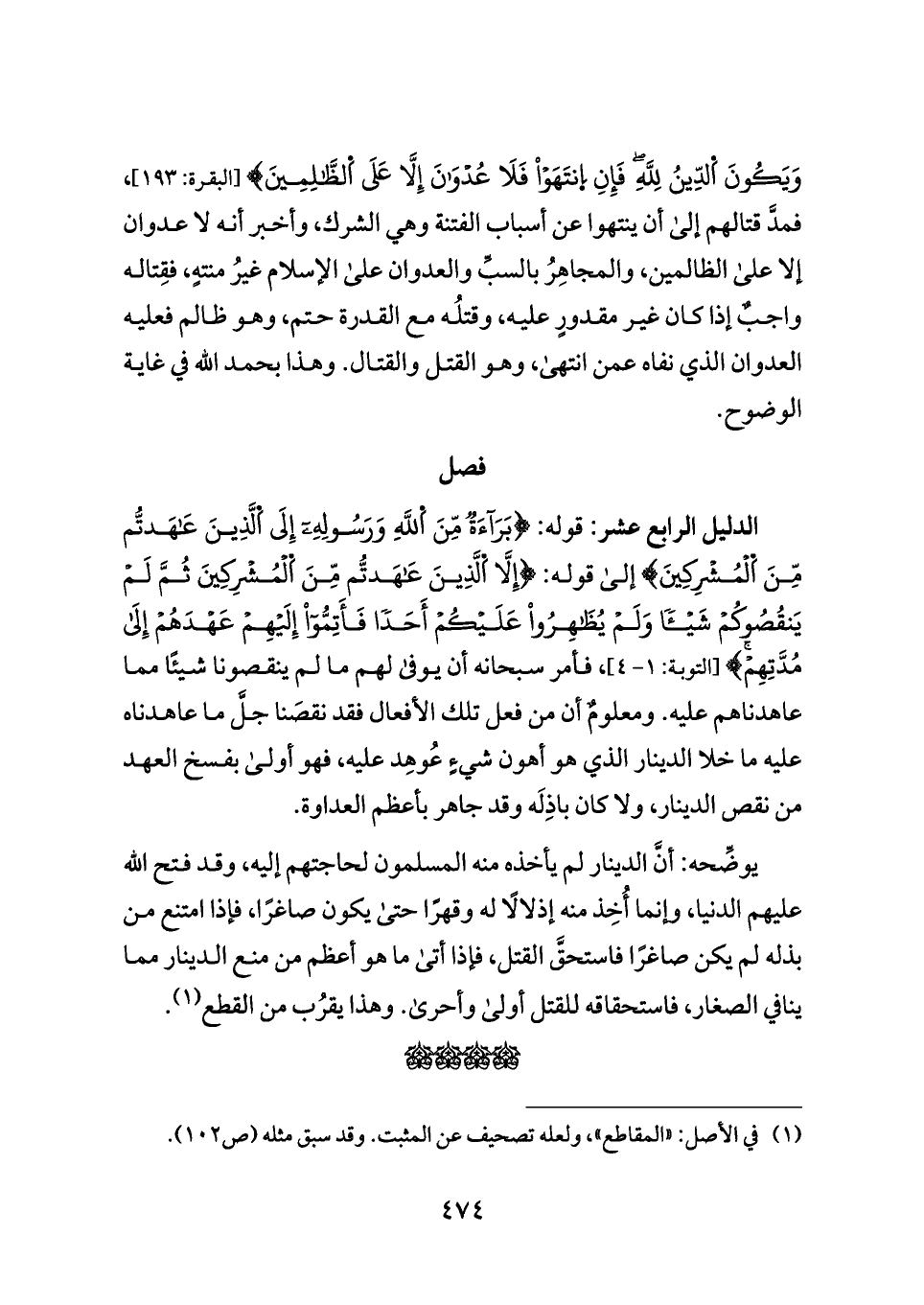 الدليل الرابع عشر: قوله: {بَرَاءَةٌ مِّنَ اَللَّهِ وَرَسُولِهِ إِلَى اَلَّذِينَ عَاهَدتُّم مِّنَ اَلْمُشْرِكِينَ} إلى قوله: {إِلَّا اَلَّذِينَ عَاهَدتُّم مِّنَ اَلْمُشْرِكِينَ ثُمَّ لَمْ يَنقُصُوكُمْ شَيْئًا وَلَمْ يُظَاهِرُوا عَلَيْكُمْ أَحَدًا فَأَتِمُّوا إِلَيْهِمْ عَهْدَهُمْ إِلَى مُدَّتِهِمْ} [التوبة: ١ - ٤]، فأمر سبحانه أن يوفى لهم ما لم ينقصونا شيئًا مما عاهدناهم عليه. ومعلومٌ أن من فعل تلك الأفعال فقد نقصَنا جلَّ ما عاهدناه عليه ما خلا الدينار الذي هو أهون شيءٍ عُوهِد عليه، فهو أولى بفسخ العهد من نقص الدينار، ولا كان باذِلَه وقد جاهر بأعظم العداوة.