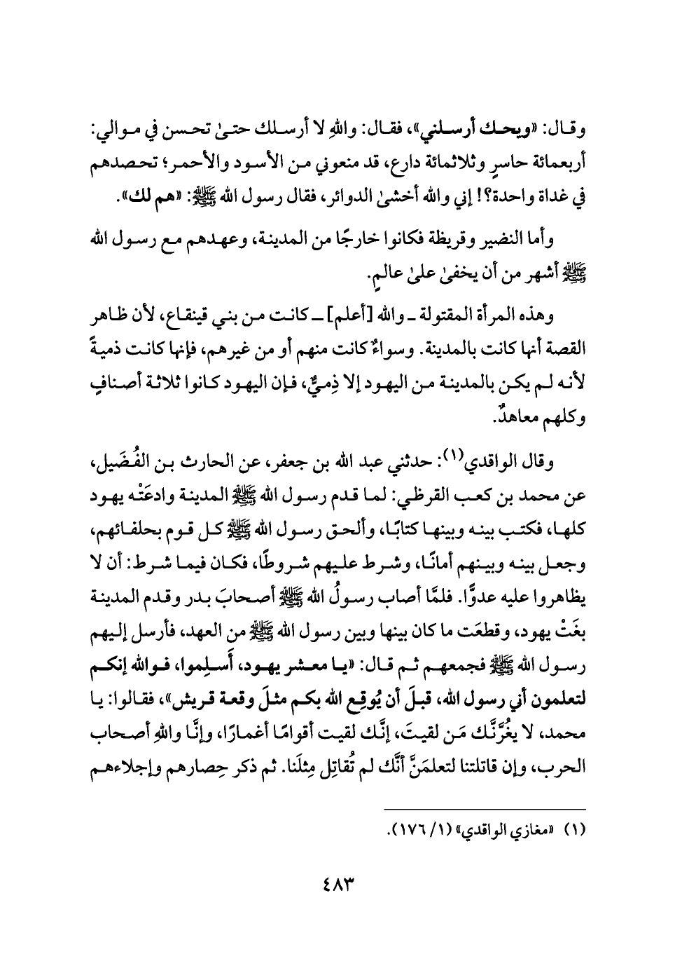 وقال الواقدي (¬١): حدثني عبد الله بن جعفر، عن الحارث بن الفُضَيل، عن محمد بن كعب القرظي: لما قدم رسول الله - صلى الله عليه وسلم - المدينة وادعَتْه يهود كلها، فكتب بينه وبينها كتابًا، وألحق رسول الله - صلى الله عليه وسلم - كل قوم بحلفائهم، وجعل بينه وبينهم أمانًا، وشرط عليهم شروطًا، فكان فيما شرط: أن لا يظاهروا عليه عدوًّا. فلمَّا أصاب رسولُ الله - صلى الله عليه وسلم - أصحابَ بدر وقدم المدينة بغَتْ يهود، وقطعَت ما كان بينها وبين رسول الله - صلى الله عليه وسلم - من العهد، فأرسل إليهم رسول الله - صلى الله عليه وسلم - فجمعهم ثم قال: «يا معشر يهود، أَسلِموا، فوالله إنكم لتعلمون أني رسول الله، قبلَ أن يُوقِع الله بكم مثلَ وقعة قريش»، فقالوا: يا محمد، لا يغُرَّنَّك مَن لقيتَ، إنَّك لقيت أقوامًا أغمارًا، وإنَّا واللهِ أصحاب الحرب، وإن قاتلتنا لتعلمَنَّ أنَّك لم تُقاتِل مِثلَنا. ثم ذكر حِصارهم وإجلاءهم