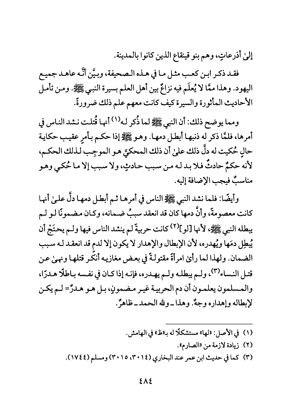 وأيضًا: فلما نشد النبي - صلى الله عليه وسلم - الناس في أمرها ثم أبطل دمها دلَّ على أنها كانت معصومةً، وأنَّ دمها كان قد انعقد سببُ ضمانه، وكان مضمونًا لو لم يبطله النبي - صلى الله عليه وسلم -، لأنها [لو] (¬٢) كانت حربيةً لم ينشد الناس فيها ولم يحتَجْ أن يُبطِل دمَها ويُهدره، لأن الإبطال والإهدار لا يكون إلا لدمٍ قد انعقد له سبب الضمان. ولهذا لما رأى امرأةً مقتولةً في بعض مغازيه أنكر قتلها ونهى عن قتل النساء (¬٣)، ولم يبطله ولم يهدره، فإنه إذا كان في نفسه باطلًا هدرًا، والمسلمون يعلمون أن دم الحربية غير مضمونٍ، بل هو هدرٌ= لم يكن لإبطاله وإهداره وجهٌ. وهذا ــ ولله الحمد ــ ظاهرٌ.