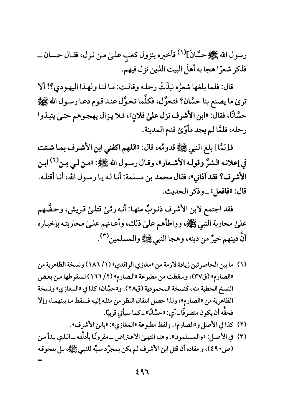 (¬٣) في الأصل: «والمسلمون». وهنا انتهى الاعتراض ــ مقرونًا بأدلَّته ــ الذي بدأ من (ص ٤٩٠)، و مفاده أن قتل ابن الأشرف لم يكن بمجرَّد سبِّه للنبي - صلى الله عليه وسلم -، بل بلحوقه بدار الحرب وتحريض الكفار على محاربته - صلى الله عليه وسلم -.