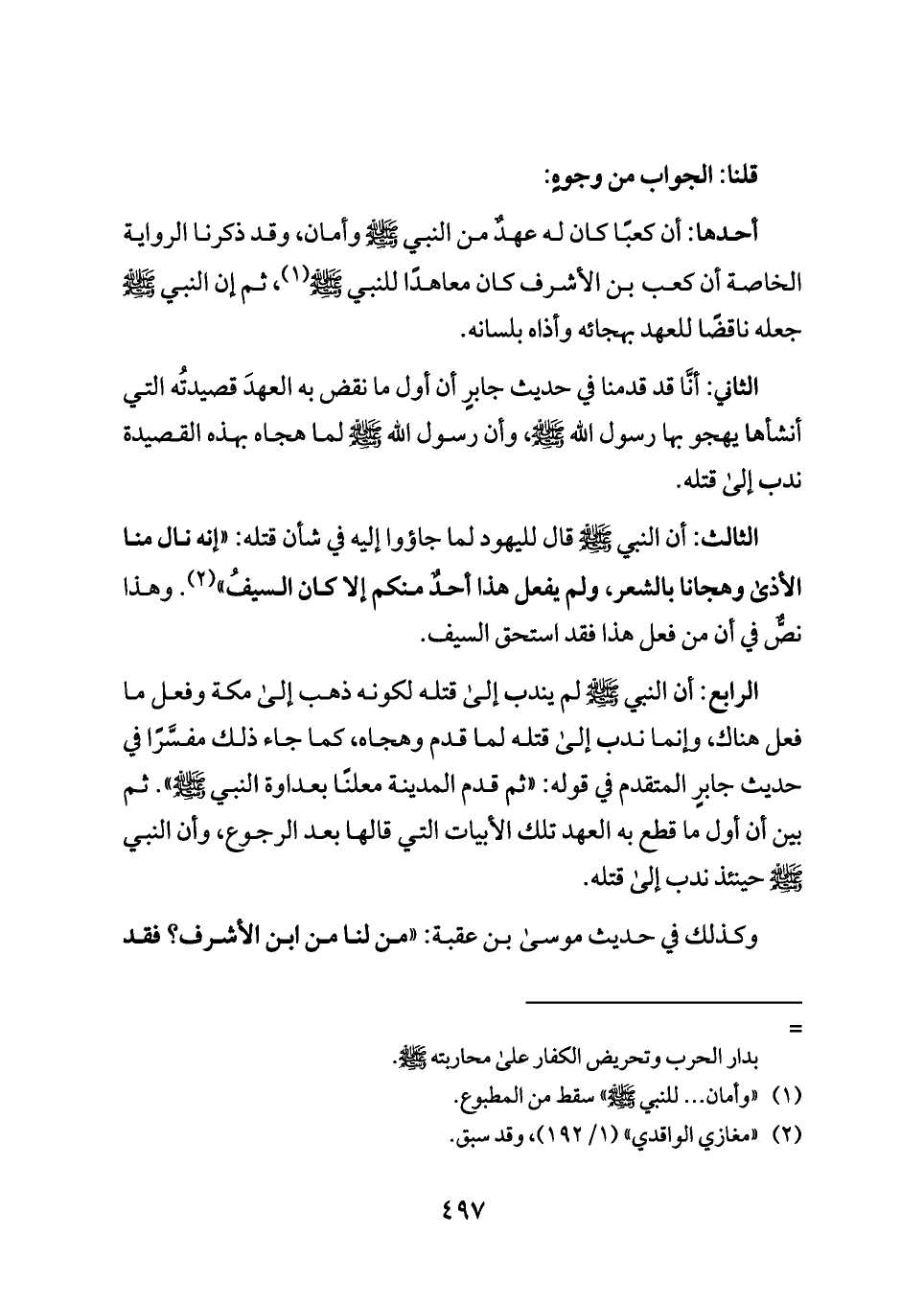 الثاني: أنَّا قد قدمنا في حديث جابرٍ أن أول ما نقض به العهدَ قصيدتُه التي أنشأها يهجو بها رسول الله - صلى الله عليه وسلم -، وأن رسول الله - صلى الله عليه وسلم - لما هجاه بهذه القصيدة ندب إلى قتله.