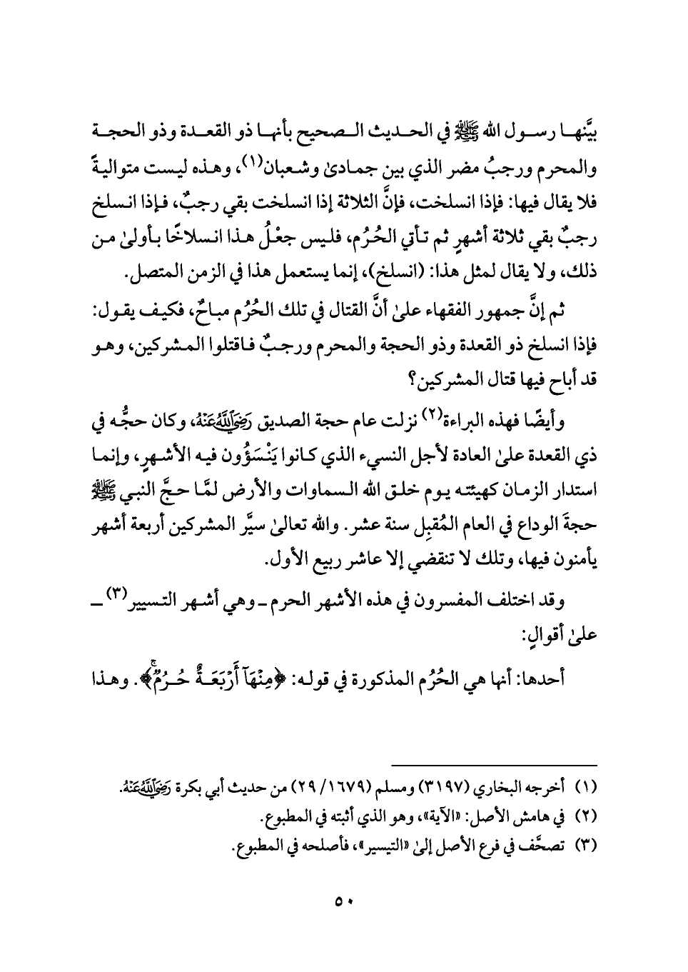 بيَّنها رسول الله - صلى الله عليه وسلم - في الحديث الصحيح بأنها ذو القعدة وذو الحجة والمحرم ورجبُ مضر الذي بين جمادى وشعبان (¬١)، وهذه ليست متواليةً فلا يقال فيها: فإذا انسلخت، فإنَّ الثلاثة إذا انسلخت بقي رجبٌ، فإذا انسلخ رجبٌ بقي ثلاثة أشهرٍ ثم تأتي الحُرُم، فليس جعْلُ هذا انسلاخًا بأولى من ذلك، ولا يقال لمثل هذا: (انسلخ)، إنما يستعمل هذا في الزمن المتصل.