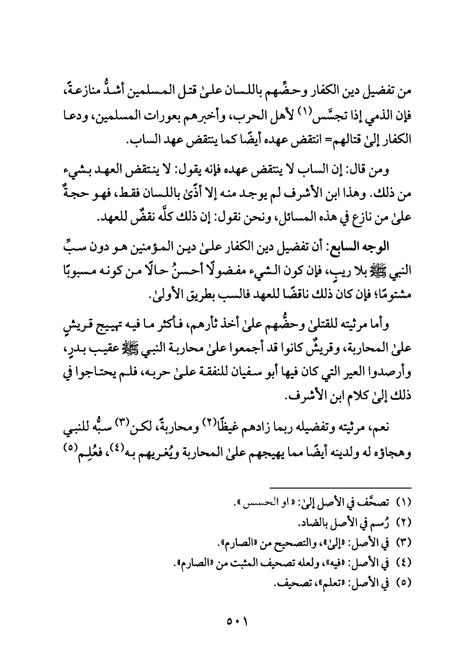 الوجه السابع: أن تفضيل دين الكفار على دين المؤمنين هو دون سبِّ النبي - صلى الله عليه وسلم - بلا ريبٍ، فإن كون الشيء مفضولًا أحسنُ حالًا من كونه مسبوبًا مشتومًا؛ فإن كان ذلك ناقضًا للعهد فالسب بطريق الأولى.