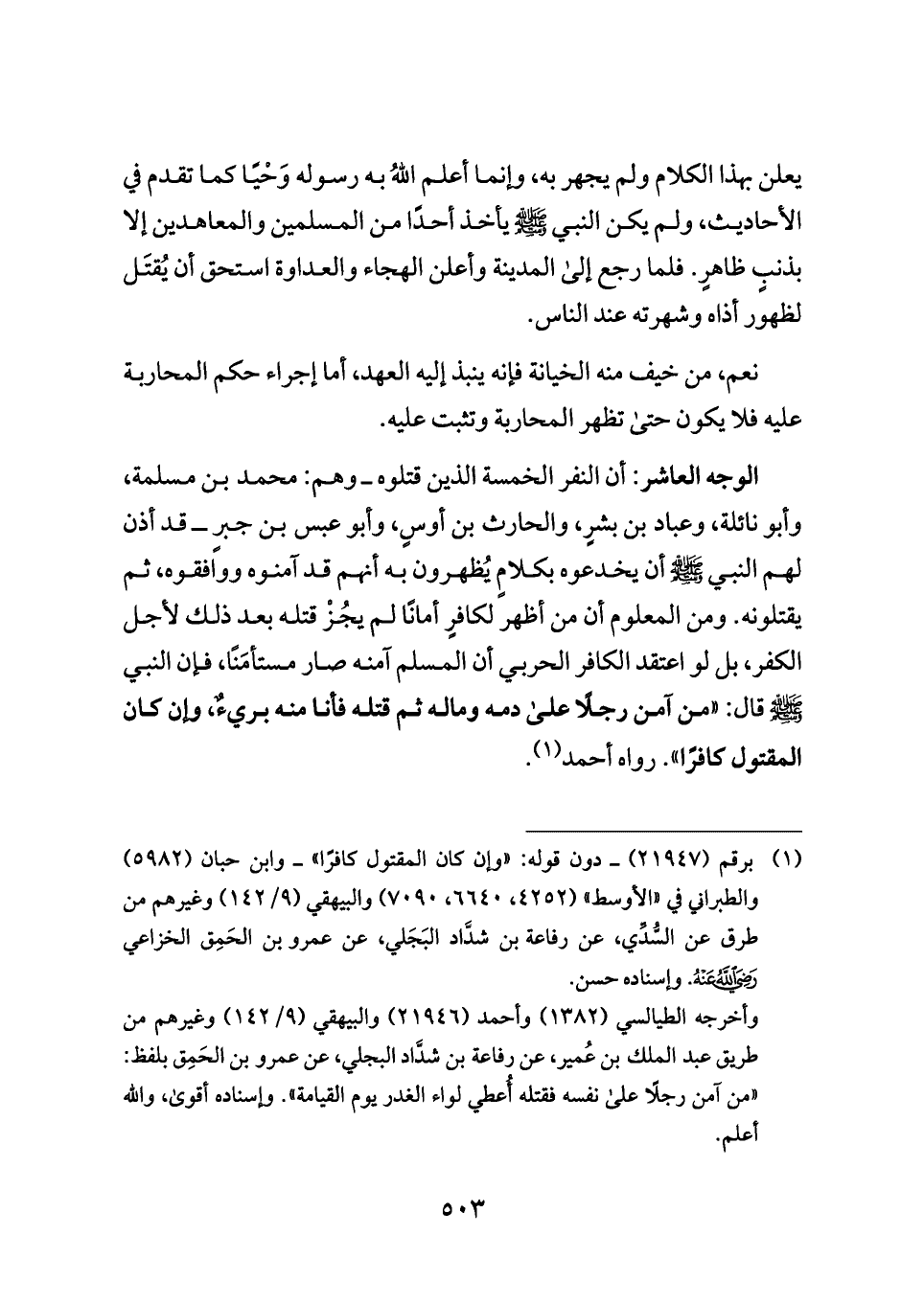 الوجه العاشر: أن النفر الخمسة الذين قتلوه ــ وهم: محمد بن مسلمة، وأبو نائلة، وعباد بن بشرٍ، والحارث بن أوسٍ، وأبو عبس بن جبرٍ ــ قد أذن لهم النبي - صلى الله عليه وسلم - أن يخدعوه بكلامٍ يُظهرون به أنهم قد آمنوه ووافقوه، ثم يقتلونه. ومن المعلوم أن من أظهر لكافرٍ أمانًا لم يجُزْ قتله بعد ذلك لأجل الكفر، بل لو اعتقد الكافر الحربي أن المسلم آمنه صار مستأمَنًا، فإن النبي - صلى الله عليه وسلم - قال: «من آمن رجلًا على دمه وماله ثم قتله فأنا منه بريءٌ، وإن كان المقتول كافرًا». رواه أحمد (¬١).