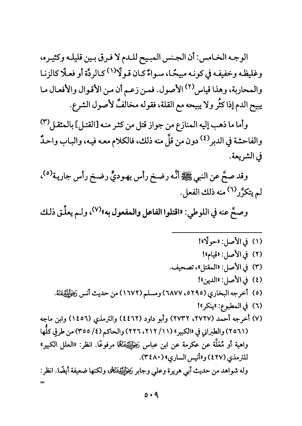 الوجه الخامس: أن الجنس المبيح للدم لا فرق بين قليله وكثيره، وغليظه وخفيفه في كونه مبيحًا، سواءٌ كان قولًا (¬١) كالردَّة أو فعلًا كالزنا والمحاربة، وهذا قياس (¬٢) الأصول. فمن زعم أن من الأقوال والأفعال ما يبيح الدم إذا كثُر ولا يبيحه مع القلة، فقوله مخالفٌ لأصول الشرع.