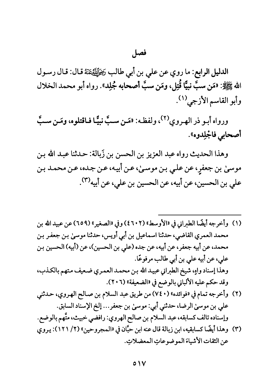 الدليل الرابع: ما روي عن علي بن أبي طالب - رضي الله عنه - قال: قال رسول الله - صلى الله عليه وسلم -: «مَن سبَّ نبيًّا قُتِل، ومَن سبَّ أصحابه جُلِد». رواه أبو محمد الخلال وأبو القاسم الأزجي (¬١).