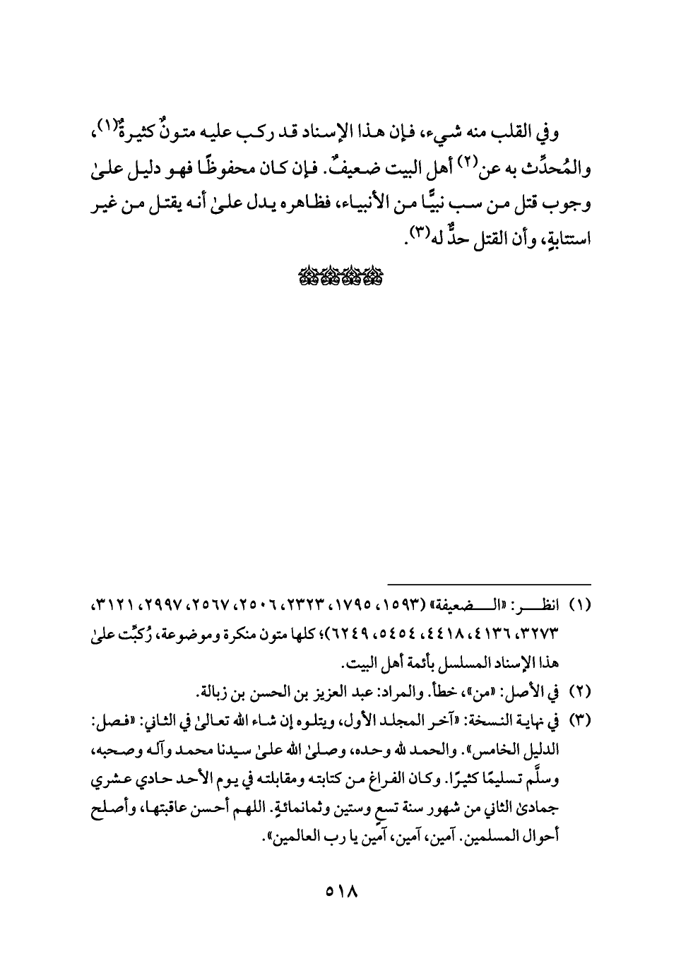 (¬١) انظر: «الضعيفة» (١٥٩٣، ١٧٩٥، ٢٣٢٣، ٢٥٠٦، ٢٥٦٧، ٢٩٩٧، ٣١٢١، ٣٢٧٣، ٤١٣٦، ٤٤١٨، ٥٤٥٤، ٦٢٤٩)؛ كلها متون منكرة وموضوعة، رُكبِّت على هذا الإسناد المسلسل بأئمة أهل البيت.