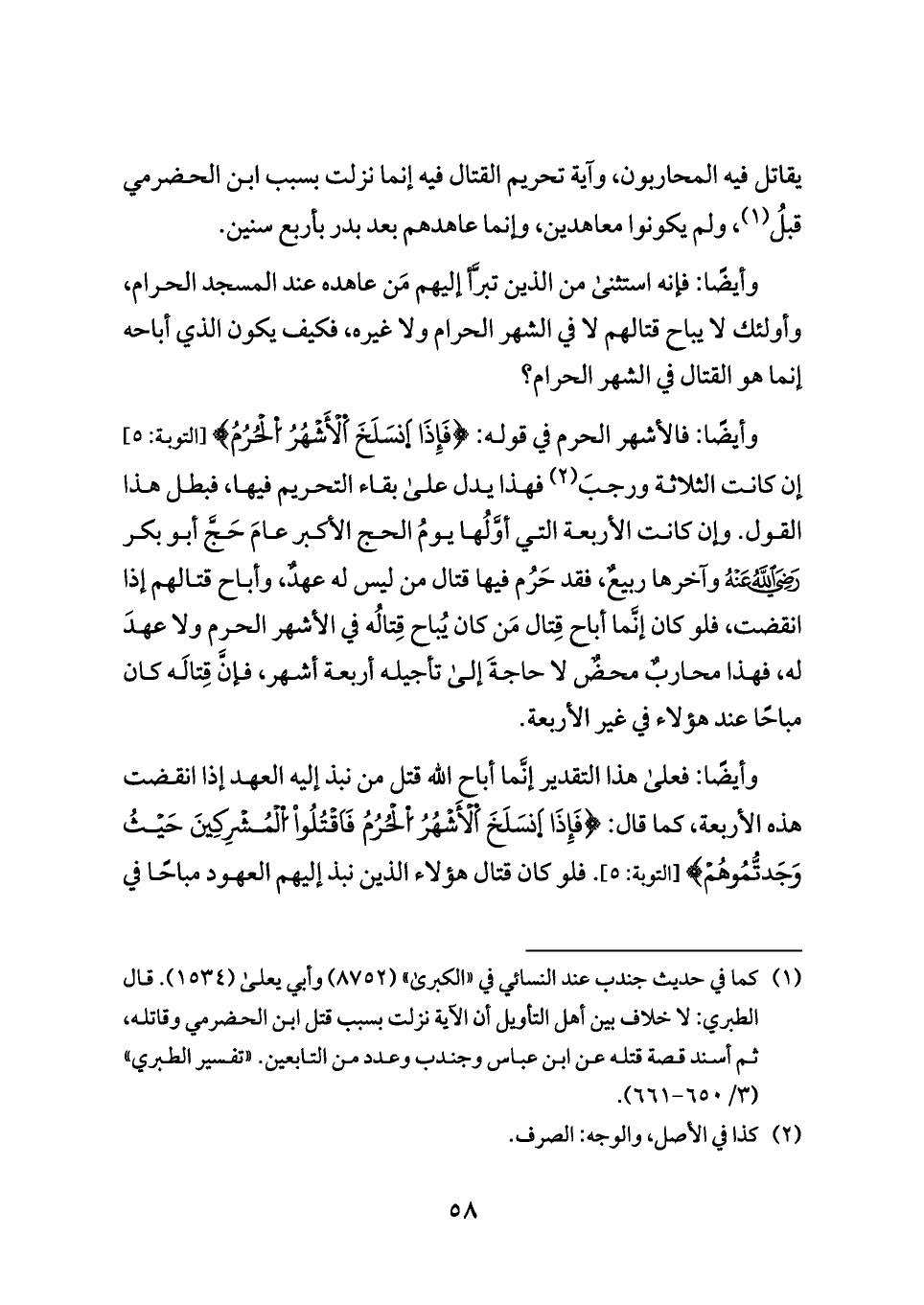 وأيضًا: فإنه استثنى من الذين تبرَّأ إليهم مَن عاهده عند المسجد الحرام، وأولئك لا يباح قتالهم لا في الشهر الحرام ولا غيره، فكيف يكون الذي أباحه إنما هو القتال في الشهر الحرام؟