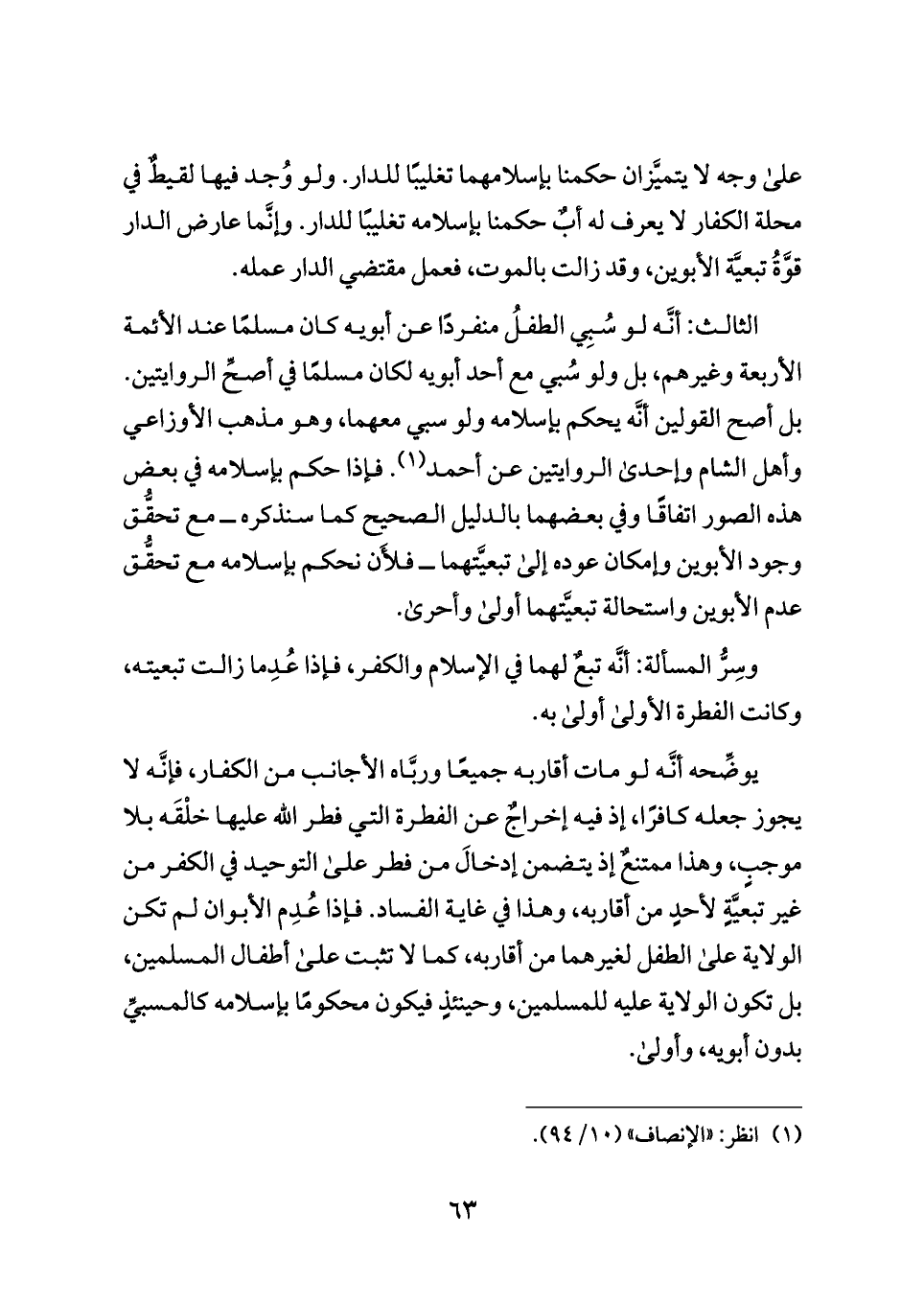 يوضِّحه أنَّه لو مات أقاربه جميعًا وربَّاه الأجانب من الكفار، فإنَّه لا يجوز جعله كافرًا، إذ فيه إخراجٌ عن الفطرة التي فطر الله عليها خلْقَه بلا موجبٍ، وهذا ممتنعٌ إذ يتضمن إدخالَ من فطر على التوحيد في الكفر من غير تبعيَّةٍ لأحدٍ من أقاربه، وهذا في غاية الفساد. فإذا عُدِم الأبوان لم تكن الولاية على الطفل لغيرهما من أقاربه، كما لا تثبت على أطفال المسلمين، بل تكون الولاية عليه للمسلمين، وحينئذٍ فيكون محكومًا بإسلامه كالمسبيِّ بدون أبويه، وأولى.