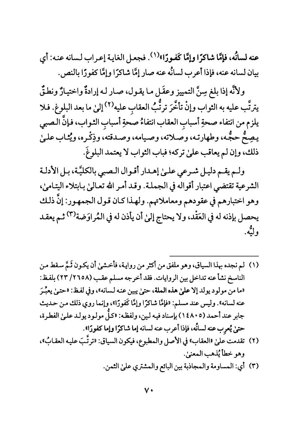 ولأنَّه إذا بلغ سِنَّ التمييز وعقَل ما يقول، صار له إرادةٌ واختيارٌ ونطقٌ يترتَّب عليه به الثواب وإنْ تأخَّرَ ترتُّبُ العقابِ عليه (¬٢) إلى ما بعد البلوغ. فلا يلزم من انتفاء صحةِ أسبابِ العقاب انتفاءُ صحةِ أسبابِ الثواب، فإنَّ الصبي يصِحُّ حجُّه، وطهارته، وصلاته، وصيامه، وصدقته، وذِكْره، ويُثاب على ذلك، وإن لم يعاقب على تركه؛ فباب الثواب لا يعتمد البلوغَ.