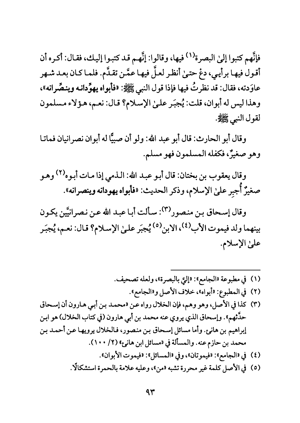 فإنَّهم كتبوا إلى البصرة (¬١) فيها، وقالوا: إنَّهم قد كتبوا إليك، فقال: أكره أن أقول فيها برأيي، دعْ حتى أنظر لعلَّ فيها عمَّن تقدَّم. فلما كان بعد شهر عاوَدته، فقال: قد نظرتُ فيها فإذا قول النبي - صلى الله عليه وسلم -: «فأبواه يهوِّدانه وينصِّرانه»، وهذا ليس له أبوان، قلت: يُجبَر على الإسلام؟ قال: نعم، هؤلاء مسلمون لقول النبي - صلى الله عليه وسلم -.