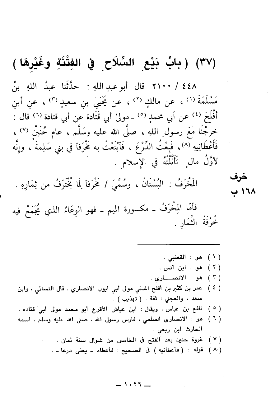 448/ 2100 - قال أبو عبد الله: حدّثنا عبد الله بن مَسْلَمة , عن مالك , عن يَحيَى بن سعيد , ابن أفْلَح عن أبي محمد - مولى أبي قتادة عن أبي قتادة قال: خرجنا مع رسول الله , صلى الله عليه وسلم, عام حُنين , فأَعْطانِيه , فبِعْت الدِّرْع , فابْتَعت به مَخْرَفا في بني سَلِمة , وإنه لأوّل مال تأَثَّلْتُه في الإسلام.