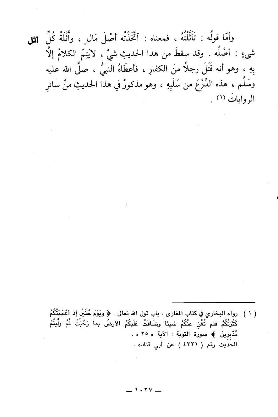 وأمّا قوله: تأَثَّلْته , فمعناه: اتَّخذته أصْل مال , وأثْلَةُ كلّ شيء: أصله. وقد سقط من هذا الحديث شيء , لا يتم الكلام إلا به , وهو أنه قَتل رجلا من الكُفار , فأعطاه النبي , صلى الله عليه وسلم , هذا الدِّرع من سَلَبه , وهو مذكور في الحديث من سائر الروايات.