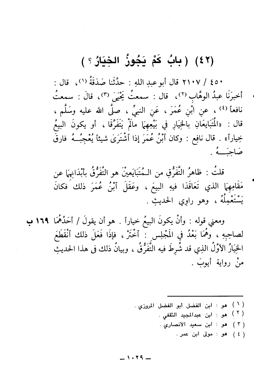 450/ 2107 - قال أبو عبد الله: حدّثنا صَدَقة , قال: أخبرنا عبد الوهاب , قال: سمعت يَحيَى , قال: سمعت نافعا , عن ابن عُمر , عن النبي , صلى الله عليه وسلم , قال: " المُتبايعان بالخِيار في بَيْعِهما ما لم يَتَفَرّقا , أو يكون البيع خِيارا ". قال نافع: وكان ابن عُمر إذا اشترى شيئا يُعجِبه فارق صاحبه.