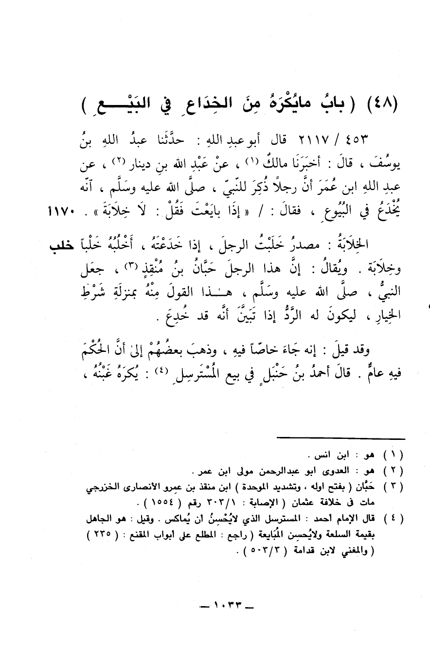 453/ 2117 - قال أبو عبد الله: حدّثنا عبد الله بن يوسُف , قال: أخبرنا مالك , عن عبد الله بن دينار , عن عبد الله ابن عُمر أنّ رجلا ذُكِر للنّبي , صلى الله عليه وسلم , أنه يُخدَع في البُيوع , فقال: " إذا بايعتَ فقُل: لا خِلابة ".