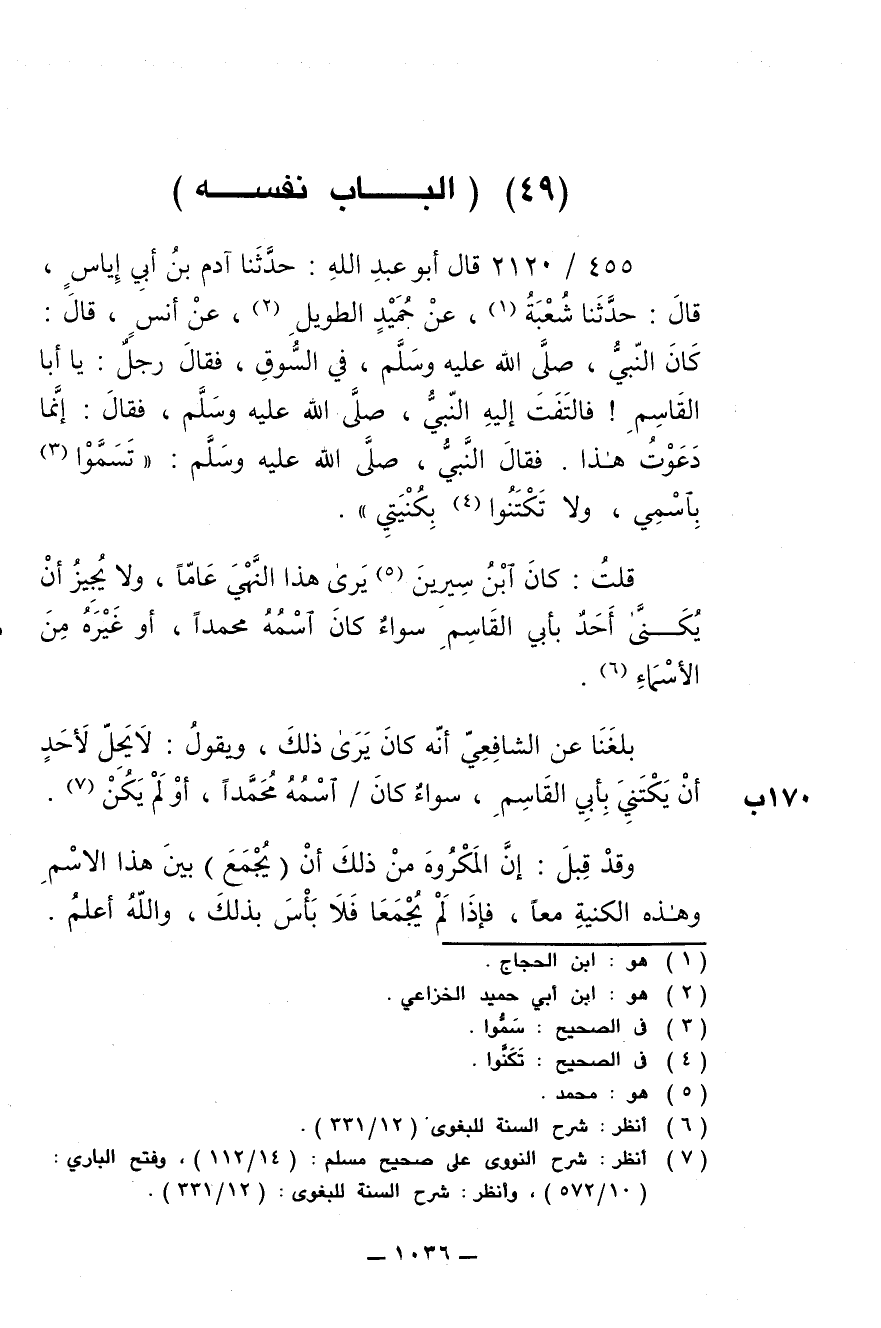 455/ 2120 - قال أبو عبد الله: حدّثنا آدم بن أبي إياس , قال: حدّثنا شُعْبة , عن حُمَيد الطويل , عن أنس , قال: كان النبي , صلى الله عليه وسلم , في السّوق , فقال رجل: يا أبا القاسم! فالتَفَتَ إليه النبي , صلى الله عليه وسلم , فقال: إنّما دَعَوتُ هذا. فقال النبي , صلى الله عليه وسلم: " تَسَمَّوا باسمي , ولا تَكْتَنوا بكُنْيَتي ".