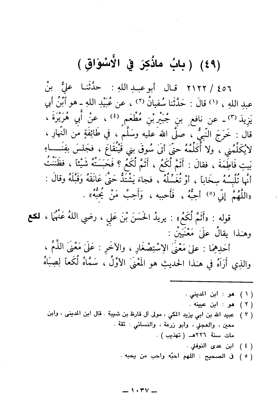 456/ 2122 - قال أبو عبد الله: حدّثنا عليّ بن عبد الله , قال: حدّثنا سفيان , عن عُبيد الله ــــ هو ابن أبي يَزيد ــــ عن نافع بن جُبير بن مُطعم , عن أبي هُريرة , قال: خَرَج النبي , صلى الله عليه وسلم , في طائفة النهار , لا يُكَلّمني , ولا أُكلّمه حتى أتَى سُوق بني قَيْنُقاع , فجلس بفناء بيت فاطمة , فقال: أثَمّ لُكَع , أثَمّ لُكَع؟ فحَبَسْته شيئا , فظننتُ أنها تُلبِسُه سِخابا , أو تُغسِّله , فجاء يشْتَدّ حتى عانقه وقبّلَه وقال: " اللهمّ إني أحِبُّه , فأحْبِبه , وأحِبّ من يُحِبُّه ".