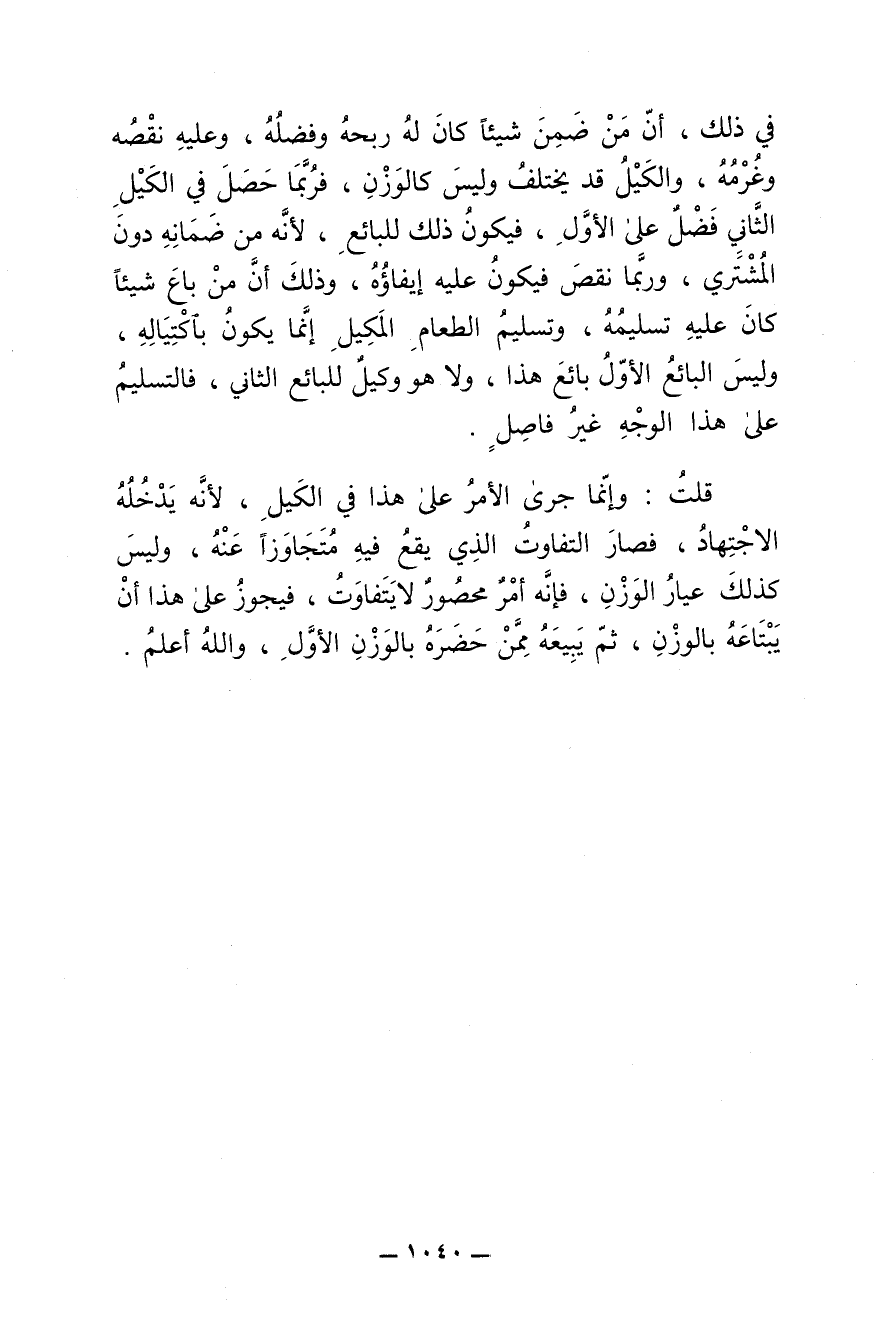 قُلتُ: وإنّما جرى الأمر على هذا في الكَيل , لأنّه يَدخُلُه الاجتِهاد , فصار التفاوُت الذي يقع فيه مُتَجاوَزا عنه , وليس كذلك عيار الوَزْن , فإنّه أمر محصور لا يَتَفاوت , فيجوز على هذا أن يبتاعه بالوزن , ثمّ يَبيعه من حَضَره بالوَزن الأوّل , والله أعلم.