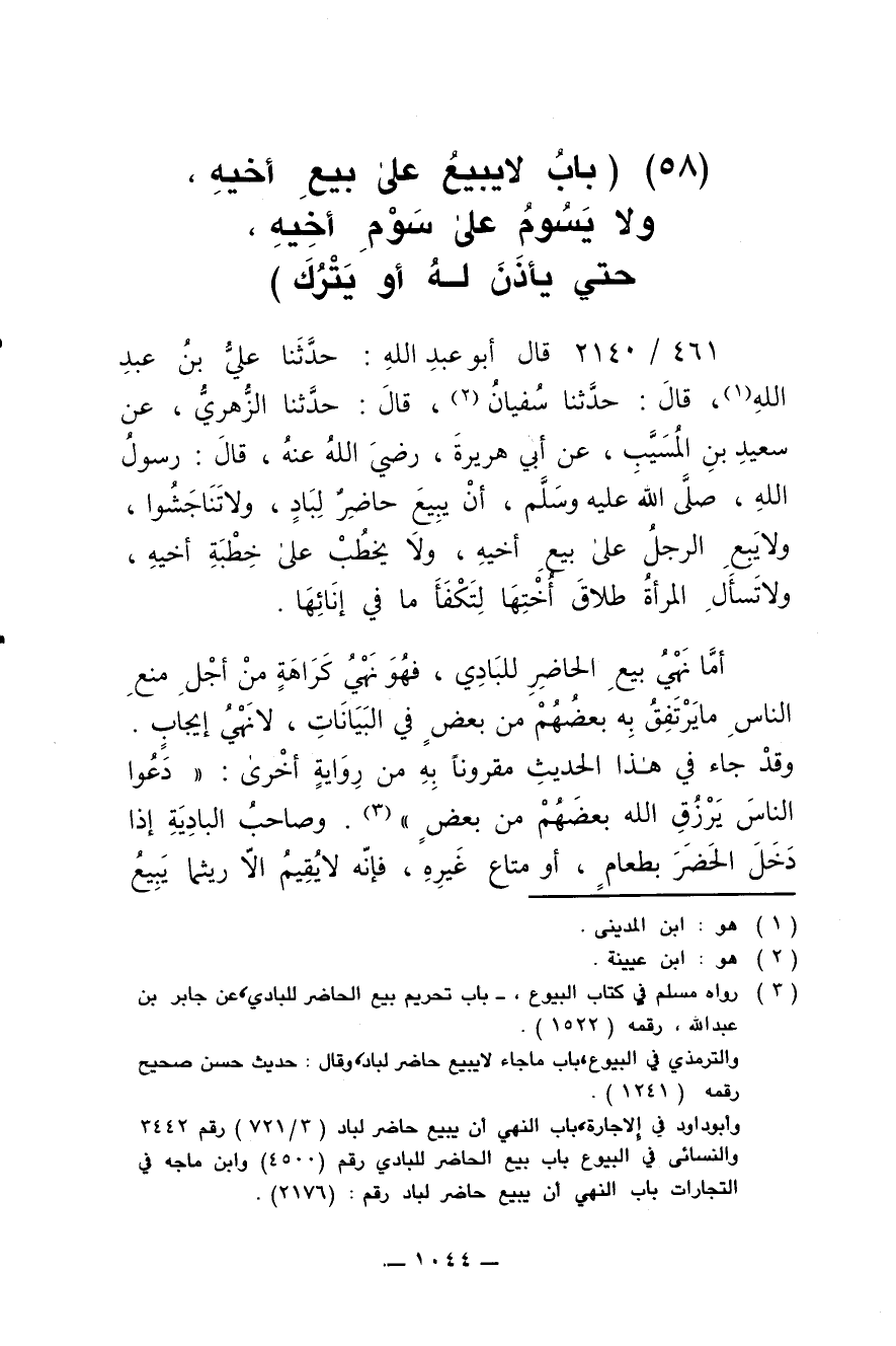 461/ 2140 - قال أبو عبد الله: حدّثنا عليّ بن عبد الله , قال حدّثنا سُفيان , قال: حدّثنا الزُّهري , عن سعيد بن المُسَيَّب , عن أبي هُريرة , رضي الله عنه , قال: نهى رسول الله , صلى الله عليه وسلم , أن يبيع حاضر لبادٍ , ولا تناجَشوا , ولا يَبِع الرجل على بَيْع أخيه , ولا يَخْطُب على خِطْبَة أخيه , ولا تسأل المرأة طلاق أختها لتَكْفَأ ما في إنائها.