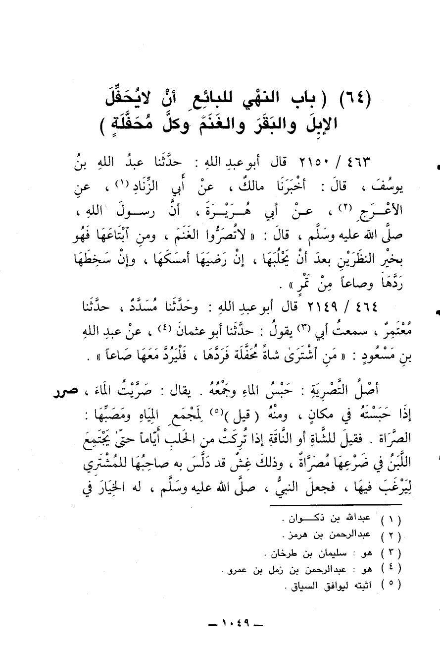 463/ 2150 - قال أبو عبد الله: حدّثنا عبد الله بن يوسُف , قال: أخبرنا مالك , عن أبي الزِّناد , عن الأعْرَج , عن أبي هُرَيرة , أنّ رسول الله , صلى الله عليه وسلم , قال: " لا تصَرّوا الغَنَم , ومن ابتاعها فهو بخير النَظَرَيْن بعد أن يَحْلُبَها إن رَضِيَها أمسَكَها , وإن سَخِطَها ردَّها وصاعا من تَمْر ".