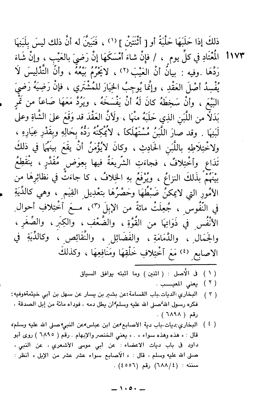ذلك إذا حَلَبها حَلْبَة أو [اثنتين] , فتَبَيَّن له أن ذلك ليس بِلَبَنِها المُعتاد في كلّ يوم , فإن شاء أمْسَكَها إن رَضِي بالعَيْب , وإن شاء ردَّها. وفيه: بيان أن العيب , لا يَحْرُم بيعه , وأنّ التَّدليس لا يُفْسِد أصل العَقْد , وإنّما يوجِب الخِيار للمُشتري , فإن رَضِيَه رضي البيع , وإن سخِطه كان له أن يفسَخَه , ويَرُدّ معها صاعا من تمر بدلا من اللبن الذي حَلَبَه منها , ولأنّ العَقْد قد وَقَع على الشّاة وعلى لَبَنها. وقد صار اللبن مُسْتَهلَكا , لا يُمكِنه رَدّه بِحاله وبِقَدْر عِياره , ولاختِلاطه باللبن الحادث , وكان لا يُؤمَن أن يَقَع بينهما في ذلك تَداع واختلاف , فجاءت الشّريعة فيها بِعِوَض مُقَدَّر , ينْقَطِع بينهم بذلك النزاع , ويُرفع به الخلاف , ما جاءت به في نظائرها من الأمور التي لا يمكن ضَبْطها وحَصرها بتعديل القِيَم , وهي كالدِّيَة في النّفوس , جُعِلَت مائة من الإبِل , مع اختلاف أحوال الأنفُس في ذواتها من القوّة , والضَّعْف , والكِبَر , والصَّغَر , والجمال , والدَّمامة , والفضائل , والنَّقائص , وكالدِّية في الأصابع مع اختلاف خَلْقِها ومنافعها , وكذلك