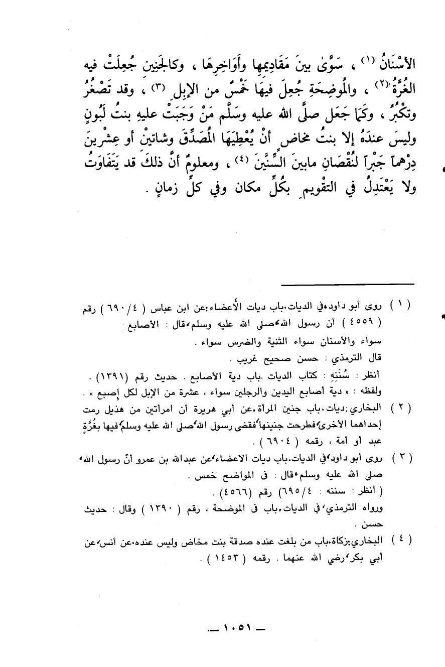 الأسنان , سَوَّى بين مَقاديمها وأواخرها , وكالجَنين جُعِلت فيه الغُرَّة , والمُوضِحَة جُعِل فيها خَمْسٌ من الإبِل , وقد تصغُر وتكبُر , وكما جعل صلى الله عليه وسلم مَن وَجَبت عليه بنتُ لَبون وليس عِنده إلا بنت مَخاض أن يُعطِيها المُصَدِّق وشاتَيْن أو عشرين دِرْهما جَبْرا لنُقصان ما بين السّنين , ومعلوم أنّ ذلك قد يَتفاوت ولا يَعْتَدِل في التَّقْويم بكلّ مكان وفي كلّ زمان.