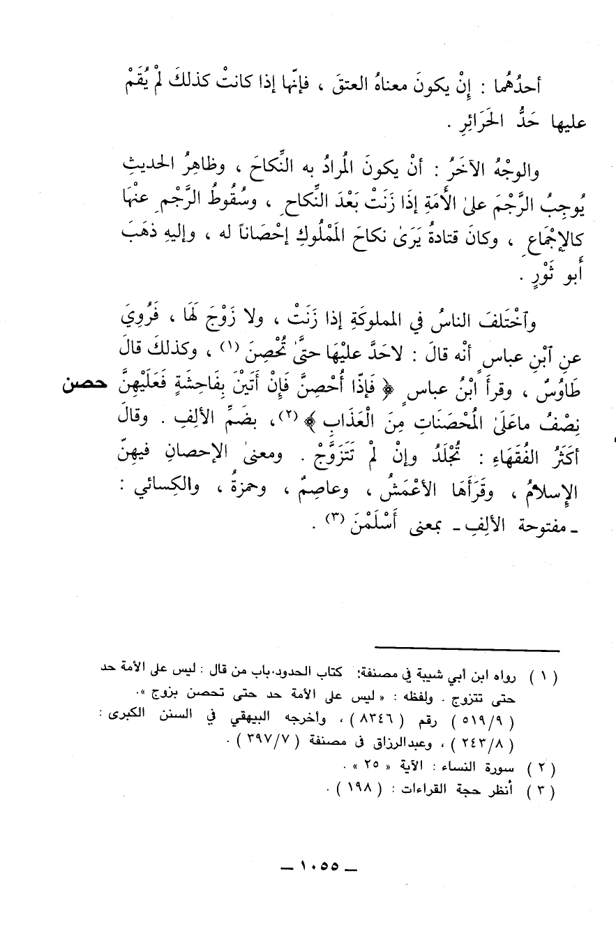 واختلف الناس في المملوكة إذا زَنَت , ولا زَوْج لها , فرُوِي عن ابن عباس أنه قال: لا حَدّ عليها حتى تُحصِن , وكذلك قال طاوس , وقرأ ابن عباس [فإذا أُحْصِنَّ فإن أتَين بفاحشة فعليهن نِصف ما على المُحصنات من العذاب] , بضمّ الألف. وقال: أكثر الفُقَهاء: تُجلَد وإن لم تَتَزوَّج. ومعنى الإحصان فيهنّ الإسلام , وقرأها الأعمش , وعاصم , وحمزة , والكِسائي: ــــ مفتوحة الألف ــــ بمعنى أسْلَمن.