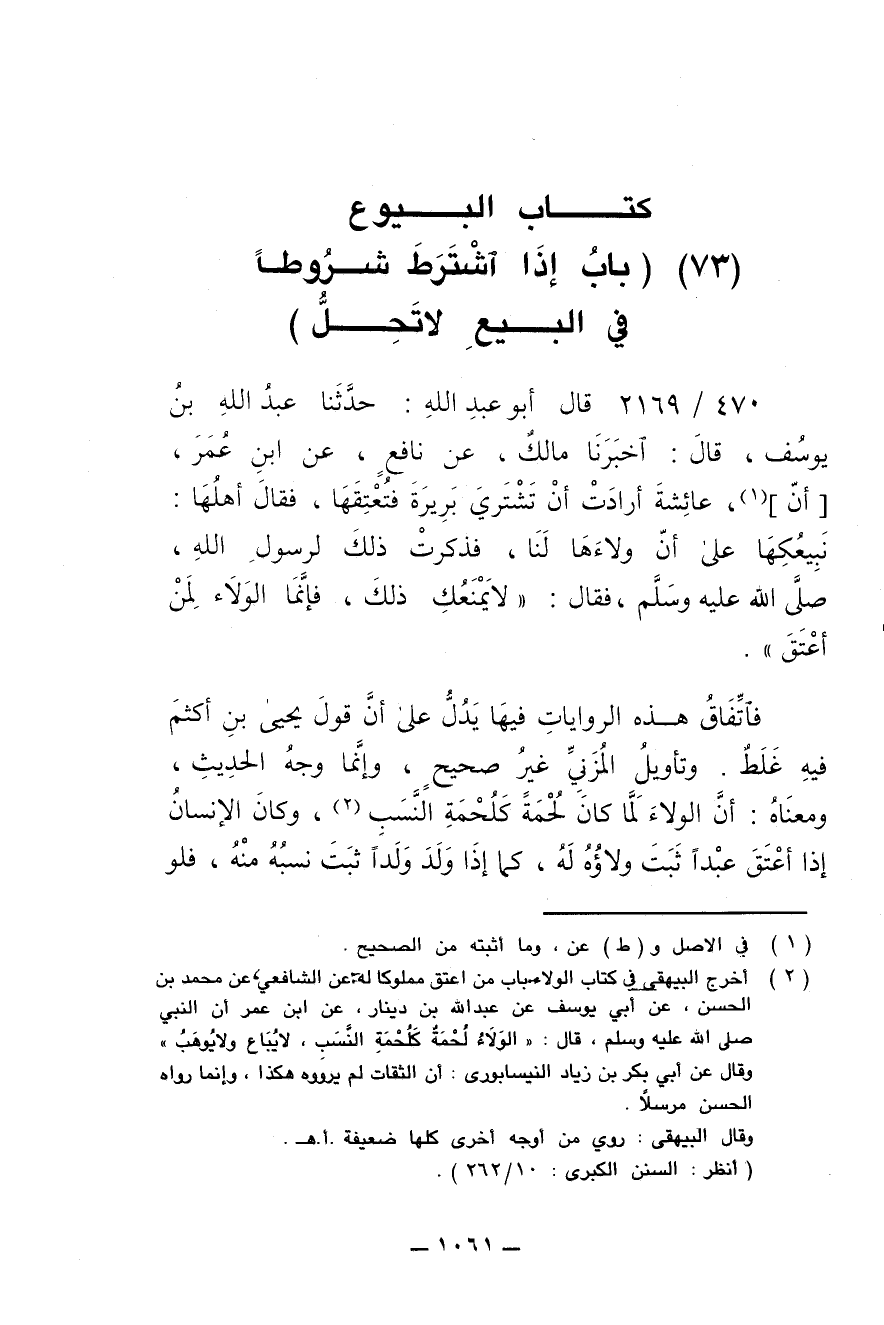 470/ 2169 - قال أبو عبد الله: حدّثنا عبد الله بن يوسُف , قال: أخبرنا مالك , عن نافع , عن ابن عُمَر , [أنّ] عائشة أرادت أن تشتري بَريرة فتُعتِقها , فقال أهلها: نبيعُكِها على أن ولاءها لنا , فذكرت ذلك لرسول الله , صلى الله عليه وسلم , فقال: " لا يَمنعُكِ ذلك , فإنّما الولاء لمن أعتق ".