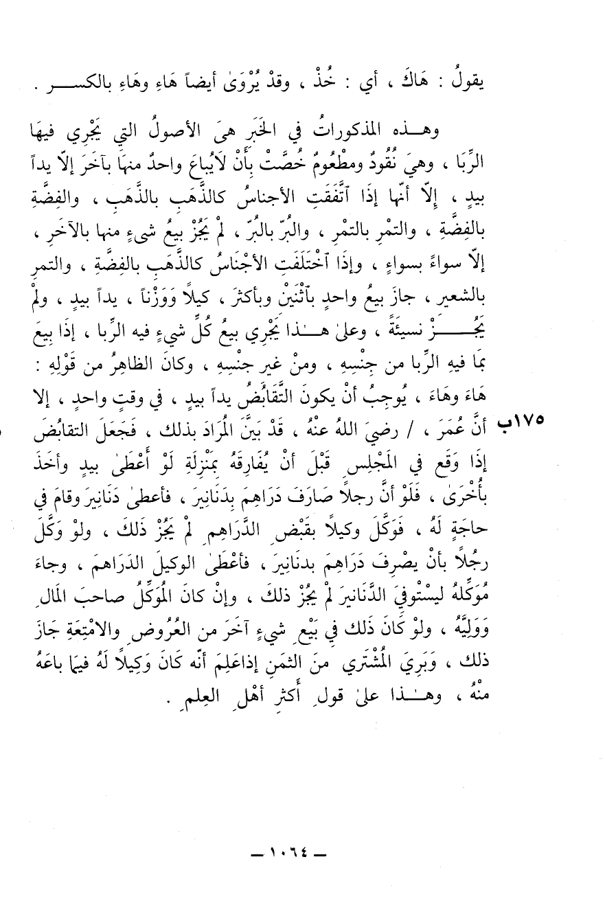 وهذه المذكورات في الخبر هي الأصول التي يجري فيها الرّبا , وهي نُقود ومطْعوم خُصّت بأن لا يُباع واحد منها بآخر إلا يدا بيد , إلا أنّها إذا اتَّفقت الأجناس كالذَّهب بالذَّهب , والفضّة بالفضّة , والتمْر بالتّمْر , والبُرّ بالبُرّ , لم يَجُز بيع شيء منها بالآخر , إلا سواءً بسواء , وإذا اختلفت الأجناس كالذهب بالفِضّة , والتّمر بالشّعير , جاز بيع واحد باثنين وبأكثر , كيلًا ووزنا , يدًا بيد , ولم يَجُز نَسيئة , وعلى هذا يجري بيع كلّ شيء في الرِّبا , إذا بِيع بما فيه الرِّبا من جِنْسِه , ومن غير جِنْسِه , وكان الظاهر من قوله: هاءَ وهاءَ , يُوجب أن يكون التقابُض يدا بيد , في وقت واحد , إلا أنّ عُمر , رضي الله عنه , قد بيَّن المُراد بذلك , فجَعل التقابض إذا وَقَع في المجلس قبل أن يُفارقه بمنزلة لو أَعْطى بيد وأخذ بأُخرى , فلو أن رجلا صارَف دارهم بدنانير , فأعطى دنانير وقام في حاجة له , فوَكَّل وكيلا بِقَبْض الدَّراهم لم يَجُز ذلك , ولو وَكَّل رجلا بأن يصرِف دراهم بدنانير , فأعطى الوكيل الدراهم , وجاء مُوَكِّله ليَسْتَوفي الدنانير لم يَجُز ذلك , وإن كان المُوَكَّل صاحب المال ووَلِيَّه , ولو كان ذلك في بيع شيء آخر من العُروض والأمتِعَة جاز ذلك , وبَرِيَ المُشتري من الثَّمَن إذا عَلِم أنّه كان وكيلا له فيما باعه منه , وهذا على قول أكثر أهل العِلم.