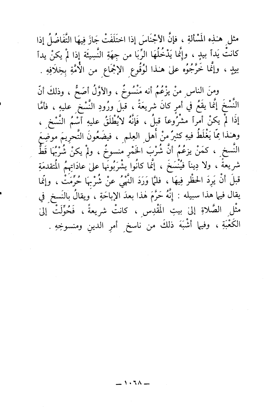 ومن النّاس من يزعُم بأنّه منسوخ , والأوّل أصحّ , وذلك أنّ النَّسخ إنّما يقع في أمر كان شريعة , قبل وُرود النّسخ عليه , فأمّا إذا لم يكن أمرا مشروعا قبل , فإنّه لا يُطلق عليه اسم النّسخ , وهذا مما يَغْلَط فيه كثير من أهل العلم , فيضعون التّحريم موضع النّسخ , كمن يزعُم أنّ شُرب الخَمْر منسوخ , ولم يكُن شُربُها قَطّ شريعة , ولا دِينًا فيُنسَخ , إنما كانوا يشربونها على عاداتهم قبل أن يَرِد الحظْر فيها , فلمّا وَرَد النّهي عن شُربها حُرِّمت , وإنّما يُقال فيما هذا سبيله: إنّه حَرَّم هذا بعد الإباحة , ويُقال بالنّسخ في مِثْل الصّلاة إلى بيت المَقْدِس , كانت شريعة , فَحُوِّلت إلى الكعبة , وفيما أشْبَه ذلك من ناسخ أمرِ الدِّين ومنسوخه.
