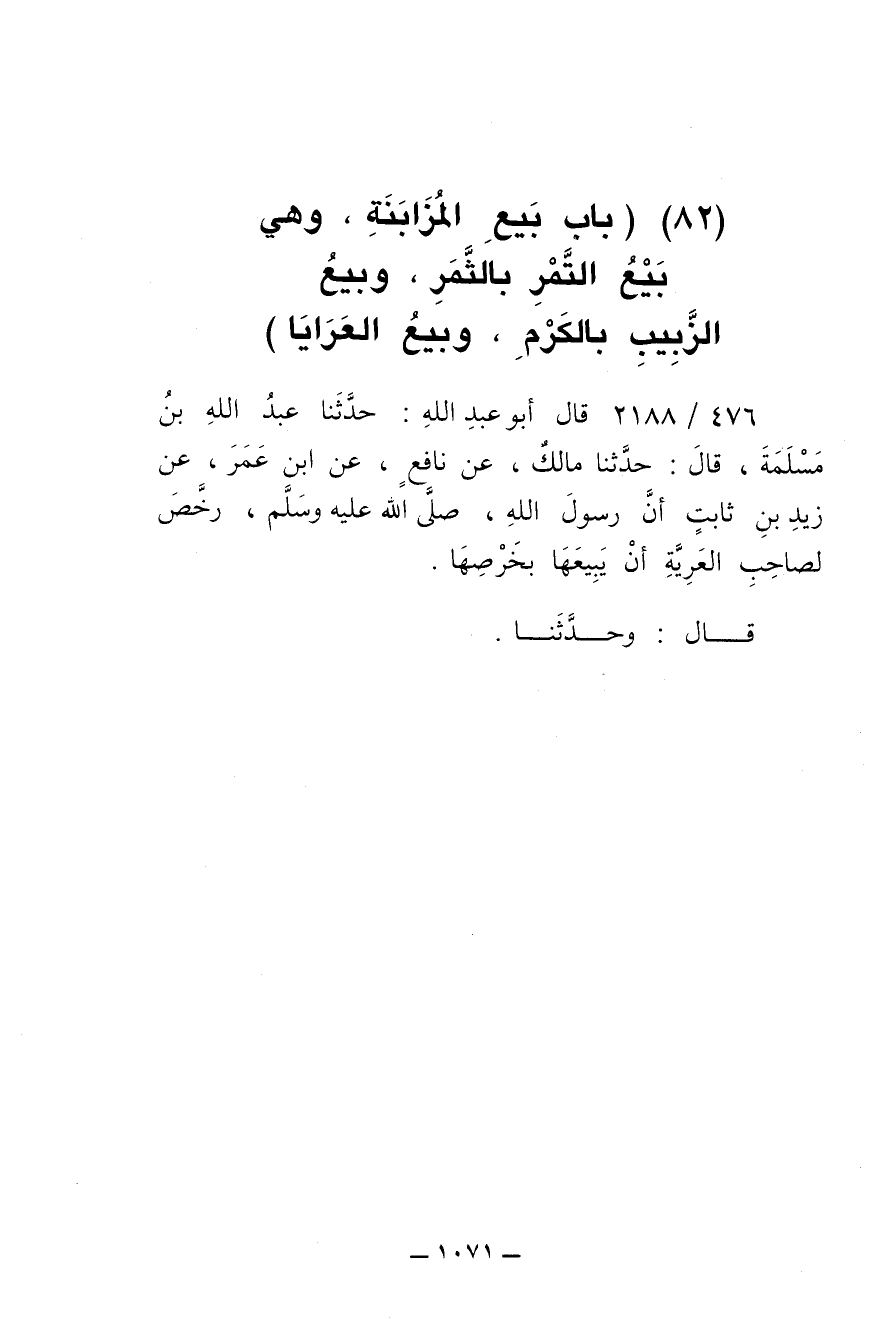 476/ 2188 - قال أبو عبد الله: حدّثنا عبد الله بن مُسْلَمَة , قال: حدّثنا مالك , عن نافع , عن ابن عُمر , عن زيد بن ثابت أنّ رسول الله , صلى الله عليه وسلم , رَخَّص لصاحب العَرِيَّة أن يبيعها بِخَرْصِها.