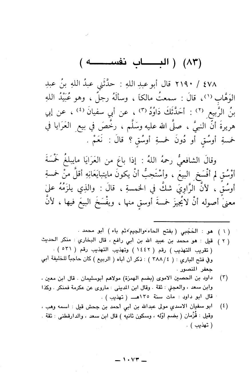 478/ 2190 - قال أبو عبد الله: حدّثني عبد الله بن عبد الوهَّاب , قال: سمعتُ مالكا , وسأله رجل , وهو عُبيد الله بن الرّبيع: أحَدَّثَك داود , عن أبي سُفيان , عن أبي هُريرة أنّ النبيّ , صلى الله عليه وسلم , رَخَّص في بيع العَرايا في خمسة أوسُق أو دون خمسة أوسُق؟ قال: نعم.