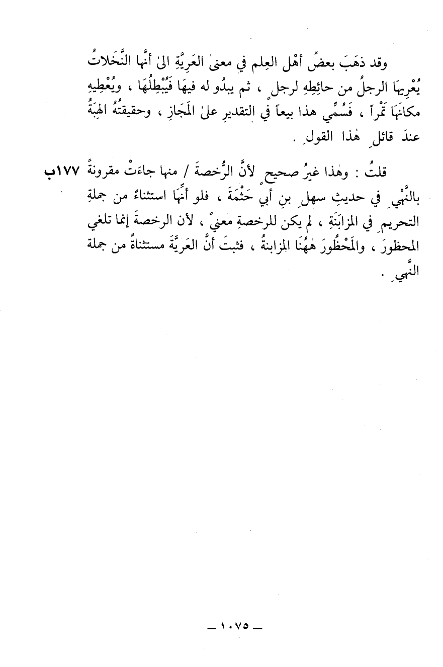 قلتُ: وهذا غير صحيح لأنّ الرُّخصة منها جاءت مقرونة بالنّهي في حديث سهل بن أبي حَثْمَة , فلو أنّها استثناء من جملة التحريم في المُزابنة , لم يكن للرخصة معنى , لأنّ للرخصة إنّما تلغي المحظور , والمحظور ههنا المزابنة , فثَبَت أنّ العَرِيّة مستثناة من جملة النّهي.