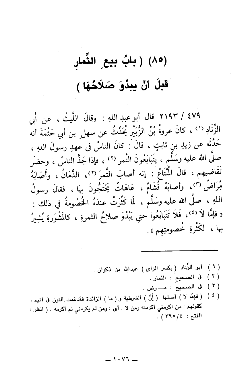 479/ 2193 - قال أبو عبد الله: وقال الليث , عن أبي الزِّناد , كان عروة بن الزّبير يُحدِّث عن سهل بن أبي حَثْمَة أنه حدَّثه عن زيد بن ثابت , قال: كان النّاس في عهد رسول الله , صلى الله عليه وسلم , يتبايعون بالتّمر , فإذا جَذَّ الناس , وحضر تقاضيهم , قال المُبتاع: إنه أصاب التّمر , الدُّمَان , وأصابه مُراض , وأصابه قُشام , عاهات يحتجّون بها , فقال رسول الله , صلى الله عليه وسلم , لمّا كَثُرت عنده الخصومة في ذلك: " فإمّا لا , فلا تتبايعوا حتى يبدو صلاح الثمرة , كالمشورة يُشير بها , لكثرة خُصومتهم ".