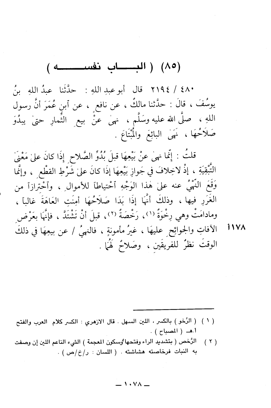 480/ 2194 - قال أبو عبد الله: حدّثنا عبد الله بن يوسُف , قال حدّثنا مالك , عن نافع , عن ابن عُمر أنّ رسول الله , صلى الله عليه وسلم , نهى عن بيع الثّمار حتى يبدو صلاحها , نهى البائع والمُبتاع.