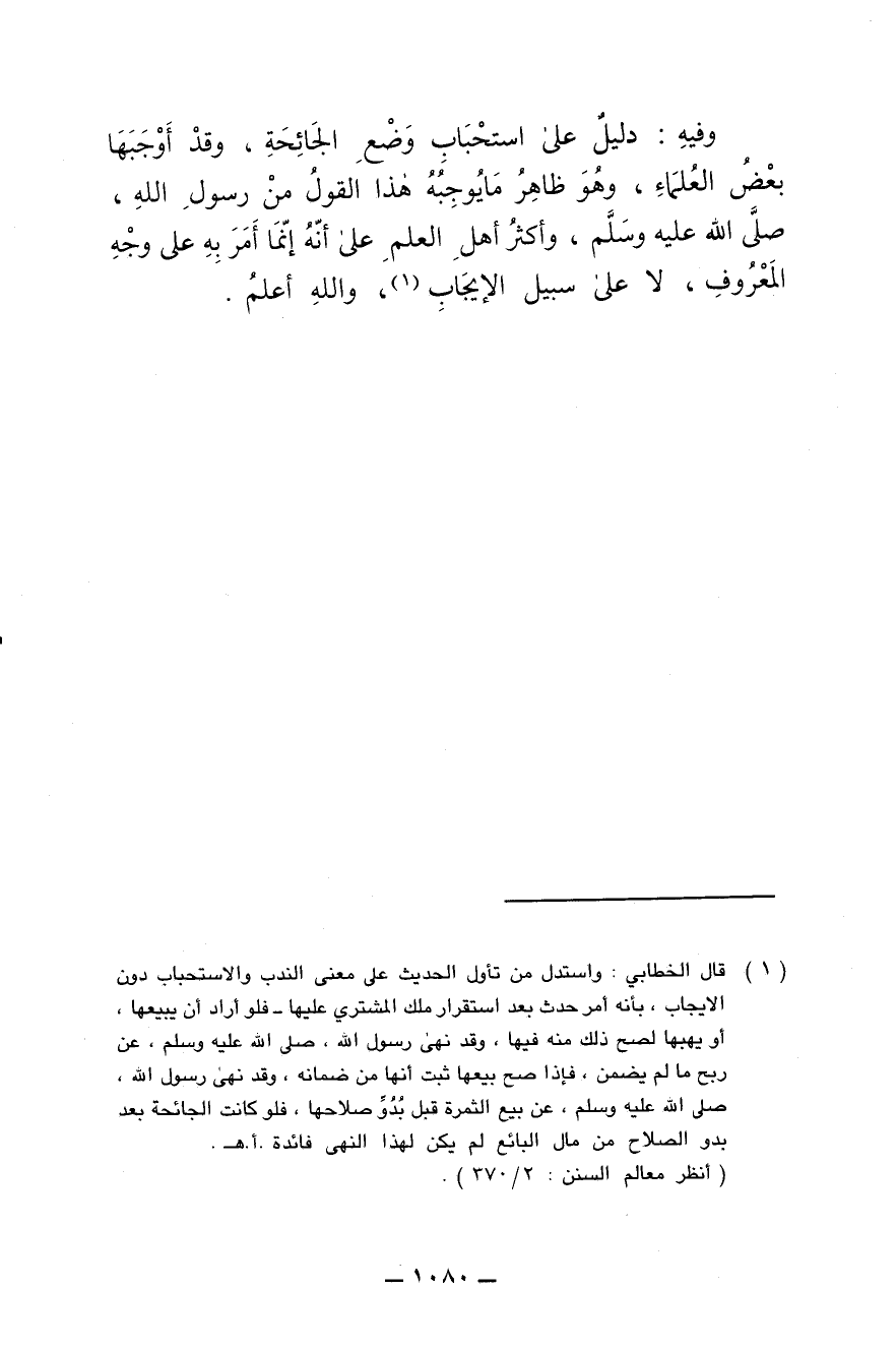 وفيه: دليل على استحباب وضع الجائحة , وقد أوجبها بعض العلماء , وهو ظاهر ما يوجبه هذا القول من رسول الله , صلى الله عليه وسلم , وأكثر أهل العلم على أنه إنّما أمَرَ به على وجه المعروف , لا سبيل الإيجاب , والله أعلم.
