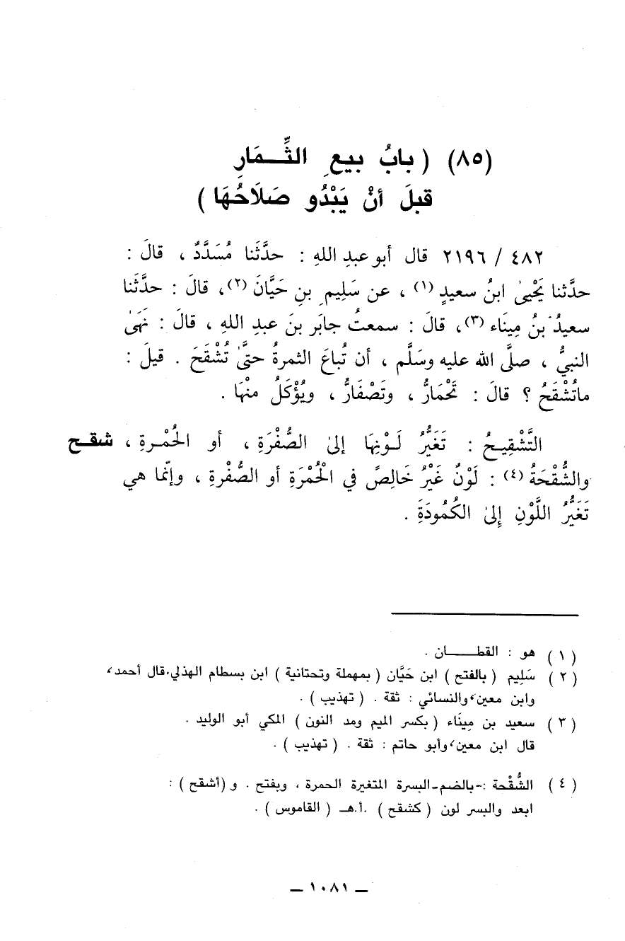 482/ 2196 - قال أبو عبد الله: حدّثنا مُسَدّد , قال: حدّثنا يحيى ابن سعيد , عن سليم بن حيّان , قال: حدّثنا سعيد بن ميناء , قال: سمعتُ جابر بن عبد الله , قال: نهى النبي , صلى الله عليه وسلم , أن تُباع الثمرةُ حتى تُشْقَح. قيل: ما تُشْقَح؟ قال: تَحْمارُّ , وتَصْفارُّ , ويؤكل منها.
