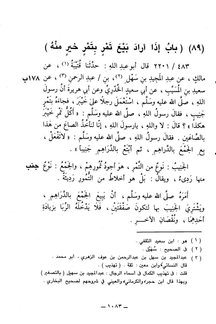 483/ 2201 - قال أبو عبد الله: حدّثنا قُتَيبة , عن مالك , عن عبد المجيد بن سهل بن عبد الرحمن , عن سعيد بن المُسَيَّب , عن أبي سعيد الخُدْري وعن أبي هُريرة أنّ رسول الله , صلى الله عليه وسلم , استعمل رجلا على خيبر , فجاءه بتمر جَنيب , فقال رسول الله , صلى الله عليه وسلم: " أَكُلُّ تمر خيبر هكذا "؟ قال: لا والله , يا رسول الله , إنّا لنأخذ الصاع من هذا بالصّاعين. فقال رسول الله , صلى الله عليه وسلم: " لا تفعل , بِعِ الجَمْع بالدراهم , ثمّ ابتع بالدراهم جَنيبا ".