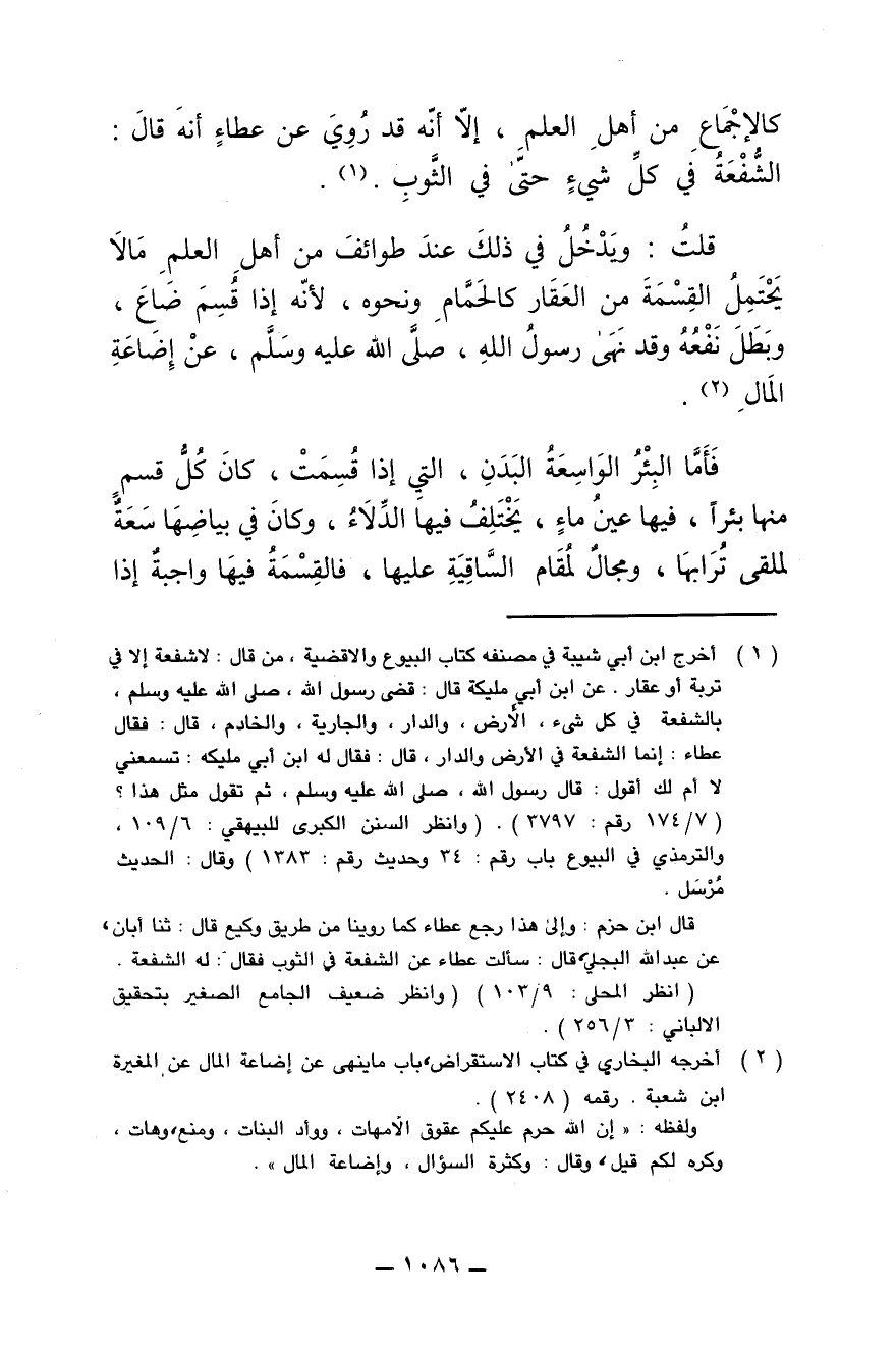 قلت: ويَدخل في ذلك عند طوائف أهل العلم ما لا يَحْتَمِل القِسمة من العَقار كالحَمَّام ونحوه , لأنّه إذا قُسِم ضاع , وبطل نَفْعُه وقد نهى رسول الله , صلى الله عليه وسلم , عن إضاعة المال.