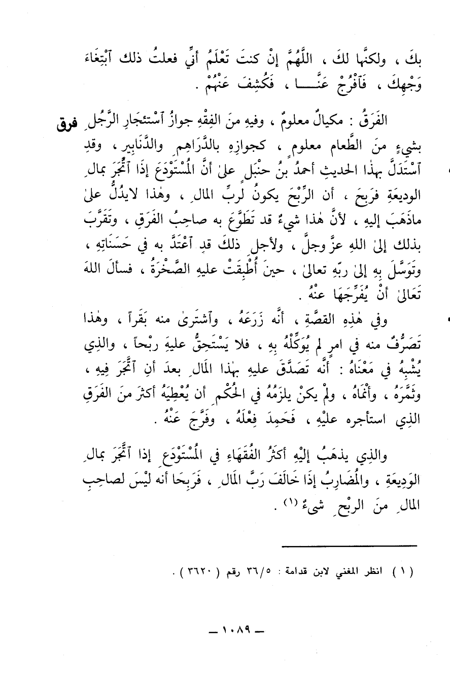 الفَرَق: مكيال معلوم , وفيه من الفِقْه جواز استئجار الرجل بشيء من الطعام معلوم , كجوازه بالدراهم والدنانير , وقد استدل بهذا الحديث أحمد بن حنبل على أنّ المُسْتَودَع إذا اتّجَر بمال الوَديعة فرَبِح , أنّ الربح يكون لربّ المال , وهذا لا يدلّ على ما ذهب إليه , لأنّ هذا شيء قد تَطَوَّع به صاحب الفَرَق , وتَقَرَّب بذلك إلى الله عزّ وجلّ , ولأجل ذلك قد اعتدّ به في حسناته , وتوسّل به إلى ربه تعالى , حين أُطْبِقَت عليه الصّخرة , فسأل الله تعالى أن يُفَرِّجَها عنه.