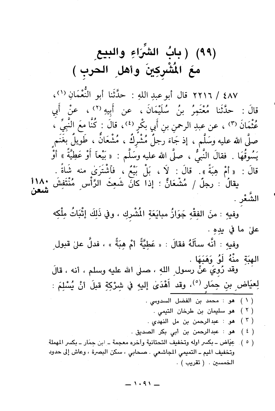 487/ 2216 - قال أبو عبد الله: حدّثنا أبو النّعمان , قال: حدّثنا مُعتَمِر بن سُليمان , عن أبيه , عن أبي عُثمان , عن عبد الرحمن بن أبي بكر , قال: كُنّا مع النبيّ , صلى الله عليه وسلم , إذ جاء رجل مُشرك , مُشْعانٌ , طويل بغنم يسوقها. فقال النبي , صلى الله عليه وسلم: " بَيْعا أو عَطِيَّة " أو قال: " أم هِبَة ". قال: لا , بل بيع , فاشترى منه شاة.