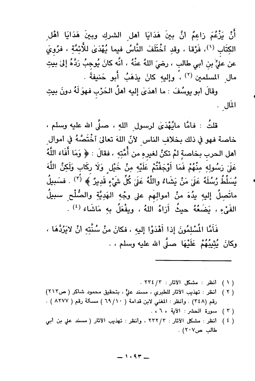 أن يَزعُم زاعم أن بين هدايا أهل الشرك وبين هدايا أهل الكتاب فَرْقا , وقد اختلف الناس فيما يُهدى للأئمة , فرُوي عن على بن أبي طالب , رضي الله عنه , أنه كا يوجِب ردّه إلى بيت مال المسلمين , وإليه كان يذهب أبو حنيفة.