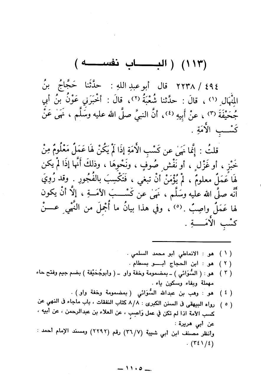494/ 2238 - قال أبو عبد الله: حدّثنا حَجَّاج بن المِنْهال , قال: حدّثنا شُعبة , قال: أخبرَني عَون بن أبي جُحَيفَة , عن أبيه , أنّ النبي صلى الله عليه وسلم , نهى عن كَسْب الأَمَة.