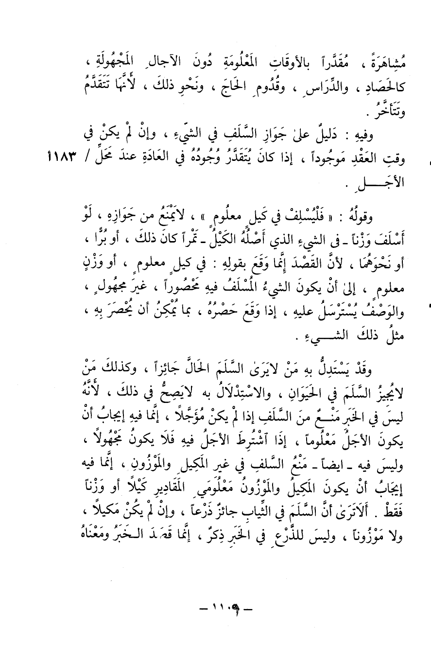 وقد يَستدل به من لا يرى السَّلَم الحاال جائزا , وكذلك من لا يُجيز السَّلم في الحيوان , والاستدلال به لا يصِح في ذلك , لأنه ليس في الخبر منع من السّلَف إذا لم يكن مؤجلا , إنما فيه إيجاب أن يكون الأجل معلوما , إذا اشترط الأجل فيه فلا يكون مجهولا , وليس فيه - أيضا - منع السَّلَف في غير المَكيل والمَوزون , إنما فيه إيجاب أن يكون المَكيل والمَوزون معلومَي المقادير كيلا أو وزنا فقط. ألا ترى أن السَّلَم في الثياب جائز ذَرْعا , وإن لم يكن مَكيلا , ولا موزونا , وليس للذَّرْع في الخبر ذِكر , إنما قَصَد الخبر ومعناه