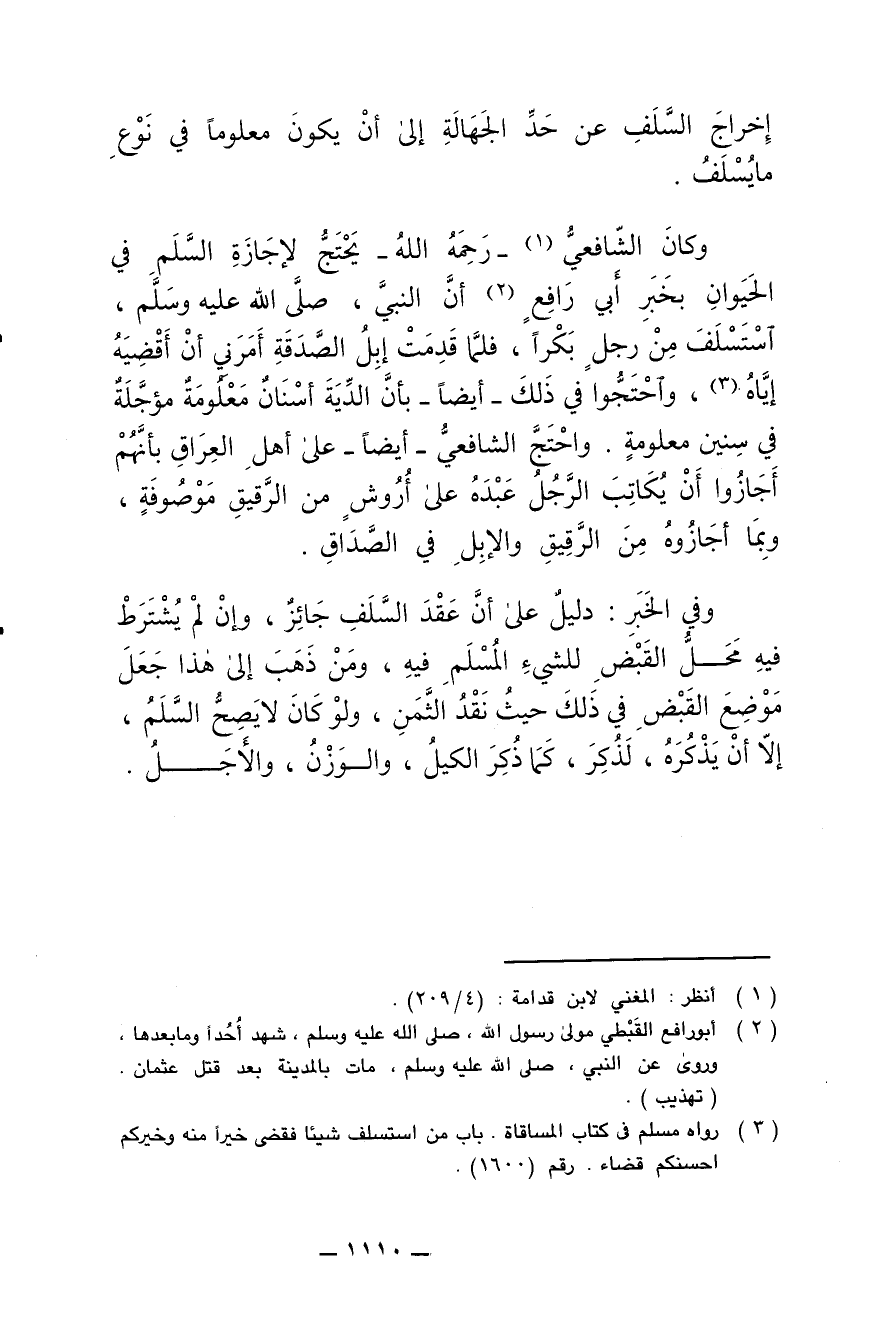 وكان الشافعي - رحمه الله - يَحْتَجُّ لإجازة السَّلَم في الحيوان بخبر أبي رافِع أن النبي , صلى الله عليه وسلم , استسلف من رجل بَكْرا , فلما قدِمَت إبْل الصَّدقة أمرني أن أقضيَه إياه , واحتجّوا في ذلك - أيضا - بأن الدِّيَة أسنان معلومة مُؤجّلة في سنين معلومة. واحتجّ الشافعي - أيضا - على أهل العِراق بأنهم أجازوا أن يُكاتِب الرّجل عَبْدهُ على أُرُوش من الرقيق موصوفة , وبما أجازوه من الرقيق والإبِل في الصَّداق.