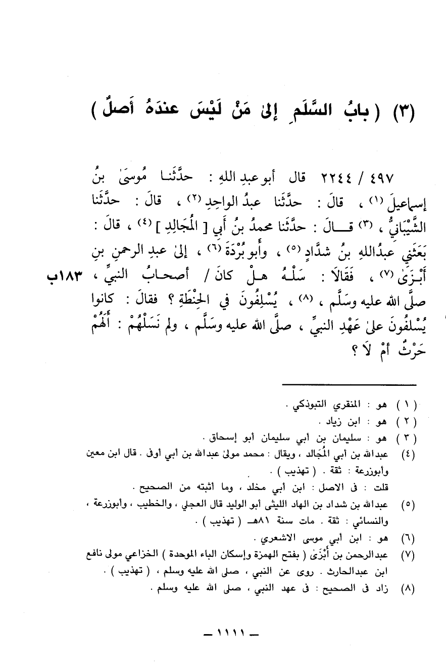 497/ 2244 - قال أبو عبد الله: حدّثنا موسى بن إسماعيل , قال: حدّثنا عبد الواحد , قال: حدّثنا الشَّيْباني , قال: حدّثنا محمد بن أبي المُجالِد , قال: بعثني عبد الله بن شدَّاد, وأبو بُرْدَة , إلى عبد الرحمن بن أبْزى , فقالا: سَلْه هل كان أصحاب النبي , صلى الله عليه وسلم , يُسْلِفون على عهد النبي , صلى الله عليه وسلم , ولم نَسَلهم: ألَهُم حَرْث أم لا؟