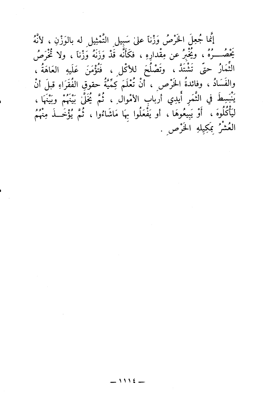 إنما جُعل الخَرْص وزنا على سبيل التمثيل به بالوزن , لأنه يَحْصُره , ويُخبِر عن مقداره , فكأنه قد وزنه وزنا , ولا تُخْرَص الثمار حتى تشتد , وتصلح للأكل , فتؤمَن عليه العاهة , والفساد , وفائدة الخَرْص , أن تُعلم كِمِيَّة حقوق الفقراء قبل أن ينبسِط في الثمر أيدي أرباب الأموال , ثم يُخلّى بينهم وبينها , ليأكلوه , أو يبيعوها , أو يفعلوا بها ما شاؤوا , ثم يؤخذ منهم العُشْر بمكيله الخَرْص.
