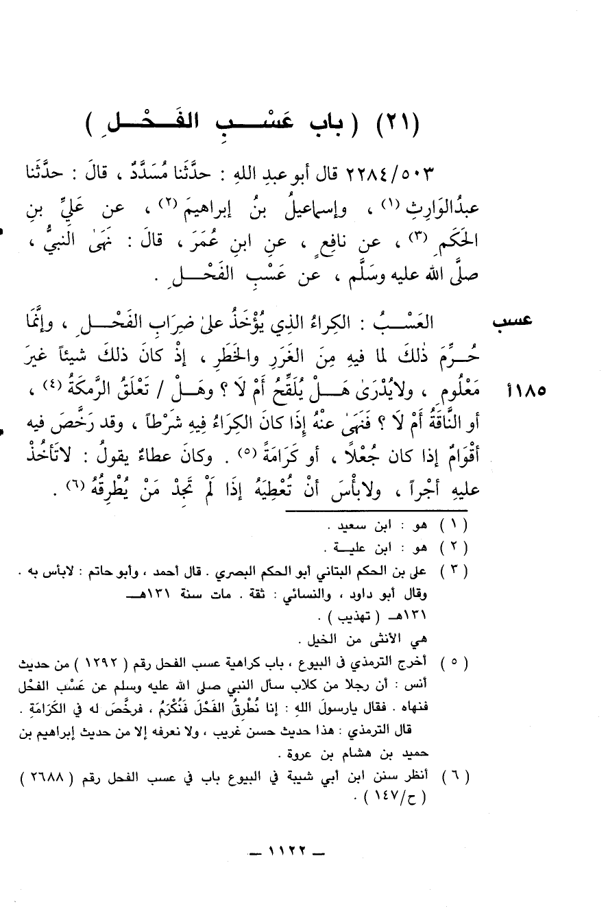 503/ 2284 - قال أبو عبد الله: حدّثنا مُسَدَّد , قال: حدّثنا عبد الوارث , وإسماعيل بن إبراهيم , عن علي بن الحَكَم , عن نافع , عن ابن عُمر , قال: نهى النبيّ , صلى الله عليه وسلم , عن عَسْب الفَحْل.